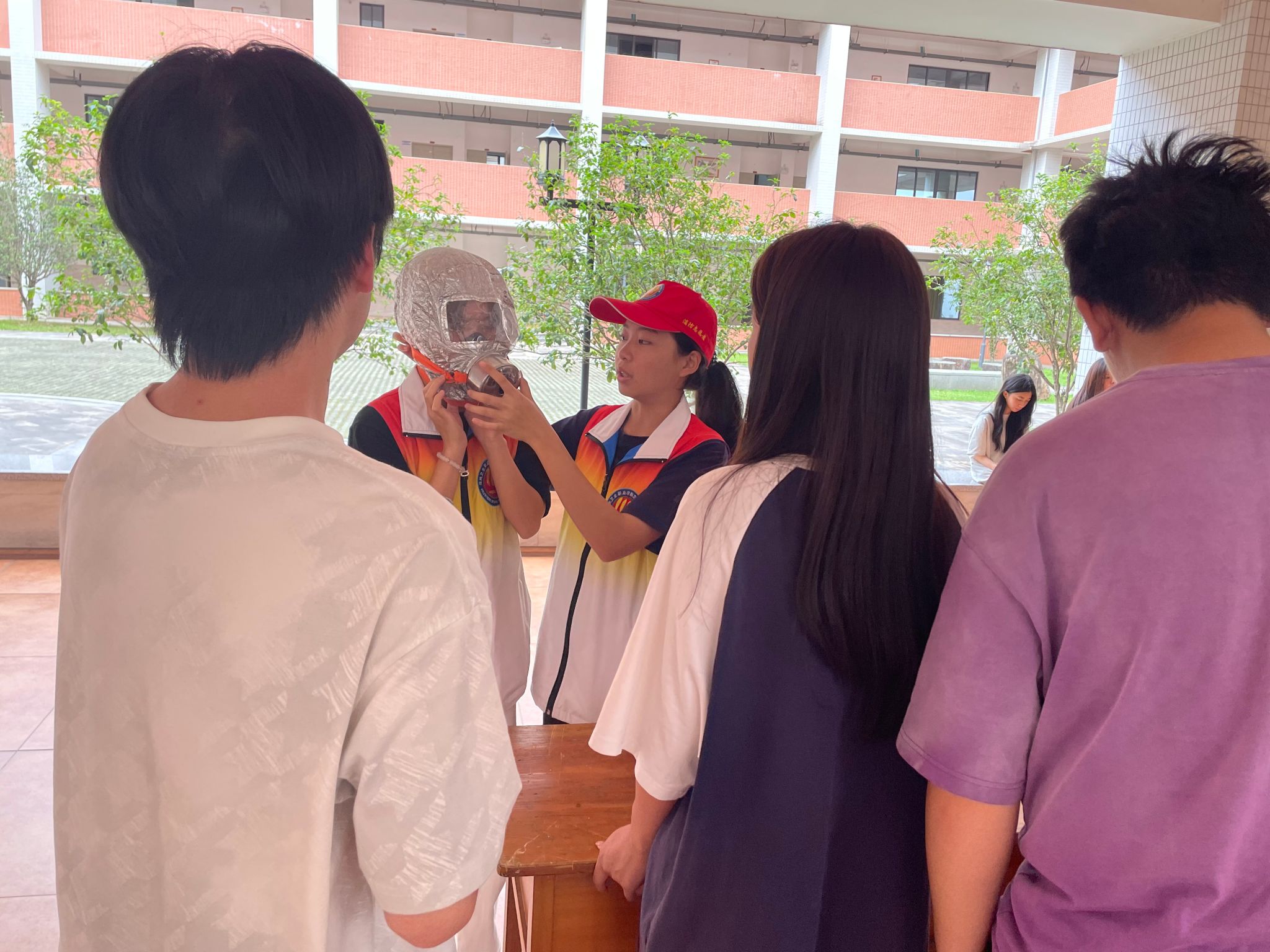 图2:消防志愿者向师生讲解如何佩戴烟感面罩