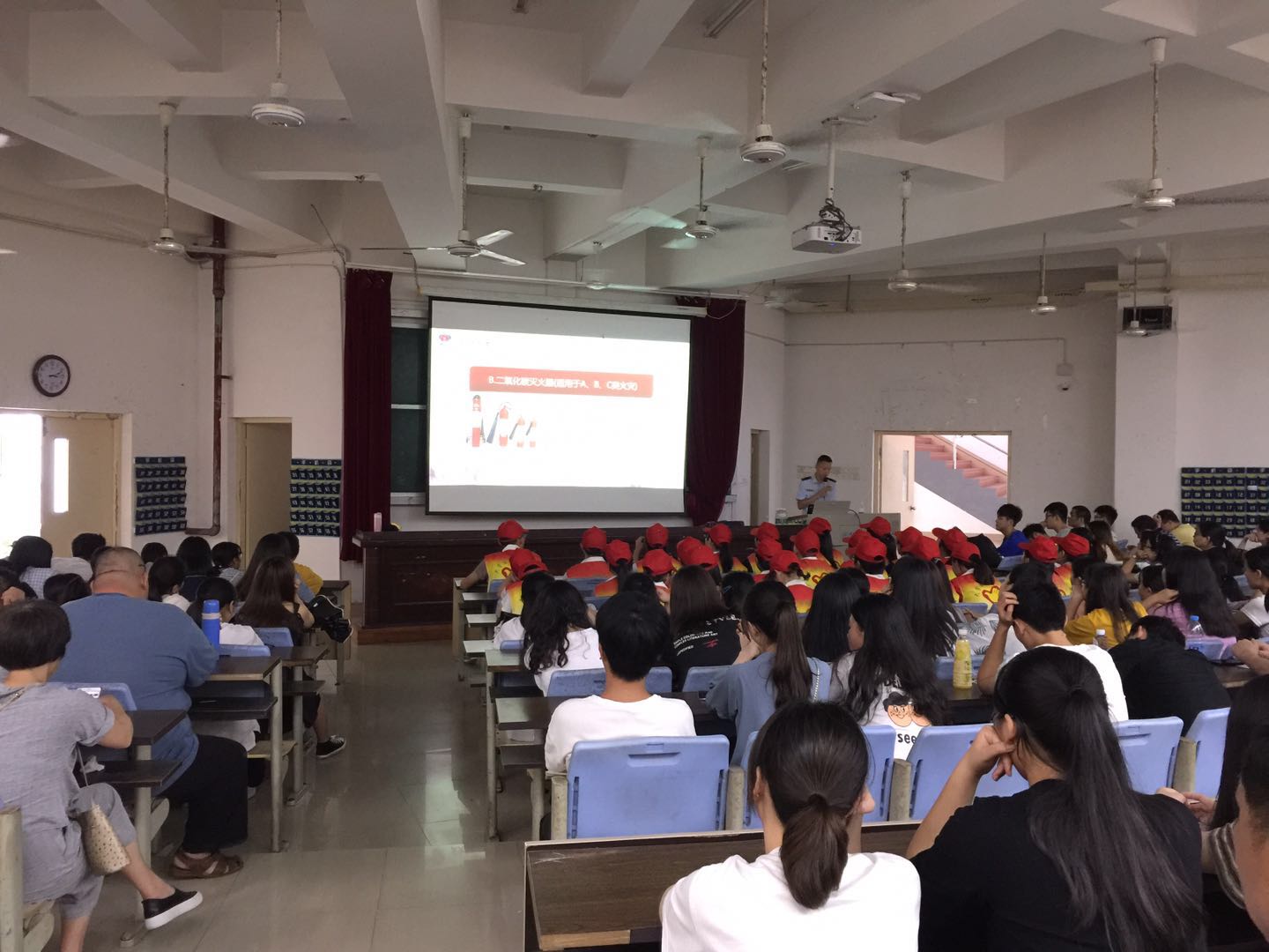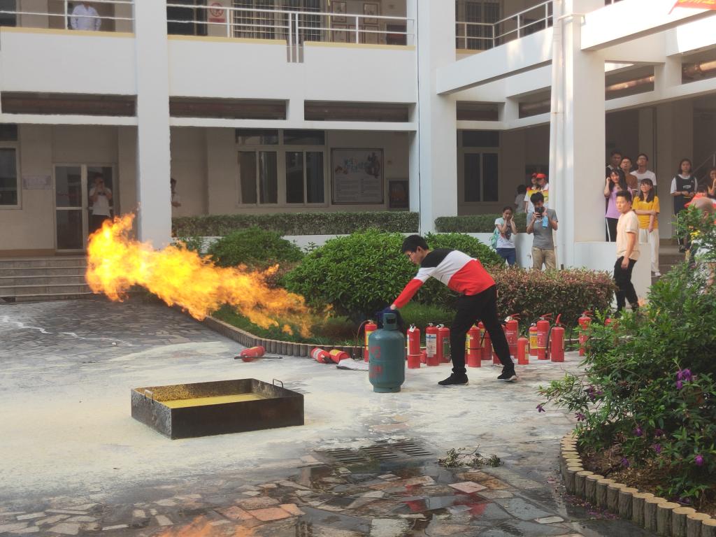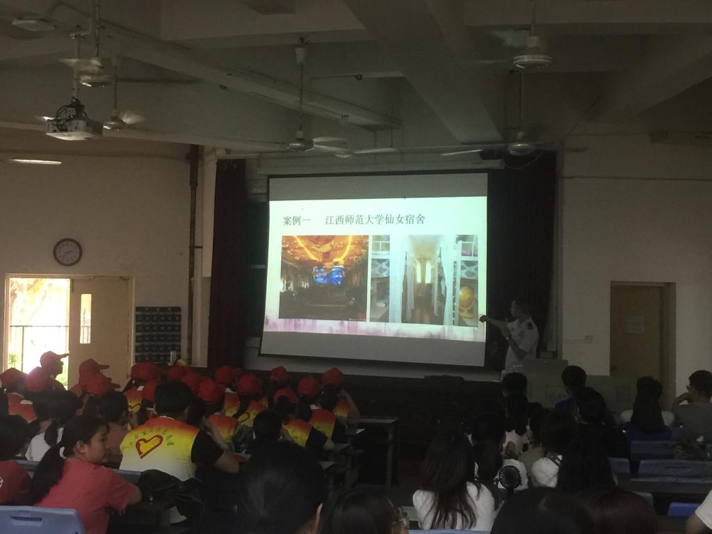 培训中,何队长首先用实例影像展示江西师范大学仙女宿舍等多起悲催事件,认真分析了当前的消防以及防震减灾安全的形势,接着运用通俗易懂的语言从发生火灾事故危险性、火灾事故防范的重点部位、火灾事故预防和控制、火灾事故现场的自救逃生、初期火灾处置方法、如何严防各类灾害和次生灾害发生等几个方面向大家讲述了消防减灾应急逃生的重要性、火灾预防和控制措施等知识。随后,何队长现场指导灭火器材的正确操作,详细解说有关减灾应急逃生的一些方法,通过问答形式巩固在场师生、物业保安人员、消防志愿者的消防和减灾应急逃生的知识,在理论与实践相结合中,更加增强了在场师生、物业保安人员、消防志愿者的消防安全意识和逃生常识。