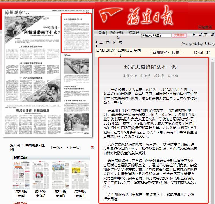 2019年12月2日,《福建日报》第十五版漳州观察﹡区域的文章《这支志愿消防队不一般》,报道了我院志愿消防大队参加学校运动会开幕式走方阵。报道如下: