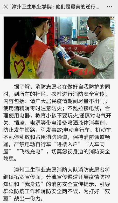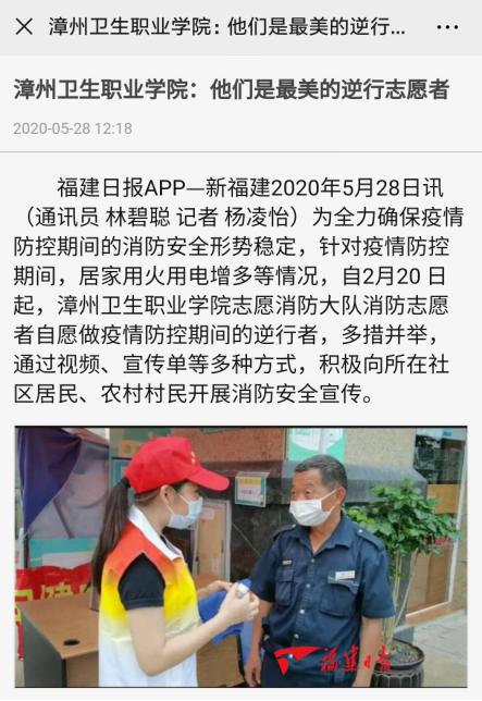 2020年5月28日,《福建日报》APP-新福建版块中报道了我院志愿消防大队消防志愿者自愿做疫情防控期间的逆行志愿者,多措并举,通过视频、宣传单等多种方式,积极向所在社区居民、农村村民开展消防安全宣传的故事。报道如下:
