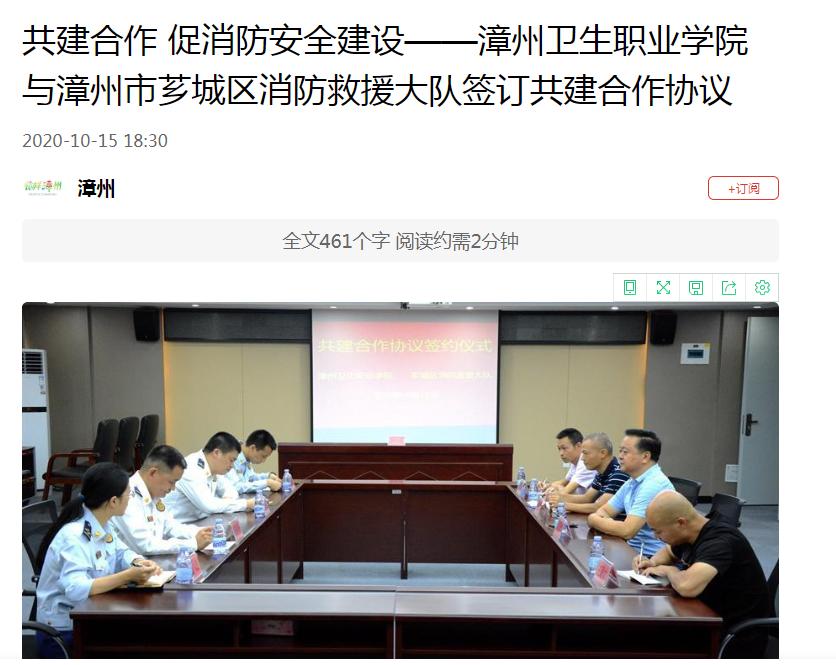 福建日报APP—新福建2020年10月15日讯(记者 杨凌怡 通讯员 陈琳霖)为进一步强化消防救援队伍与学院双方的联系合作,15日上午,漳州卫生职业学院与漳州市芗城区消防救援大队签订了共建合作协议,漳州职业卫生学院副书记黄乃光、漳州市芗城区消防救援大队大队长张喆、教导员庄添福等领导出席签约仪式并发表讲话。