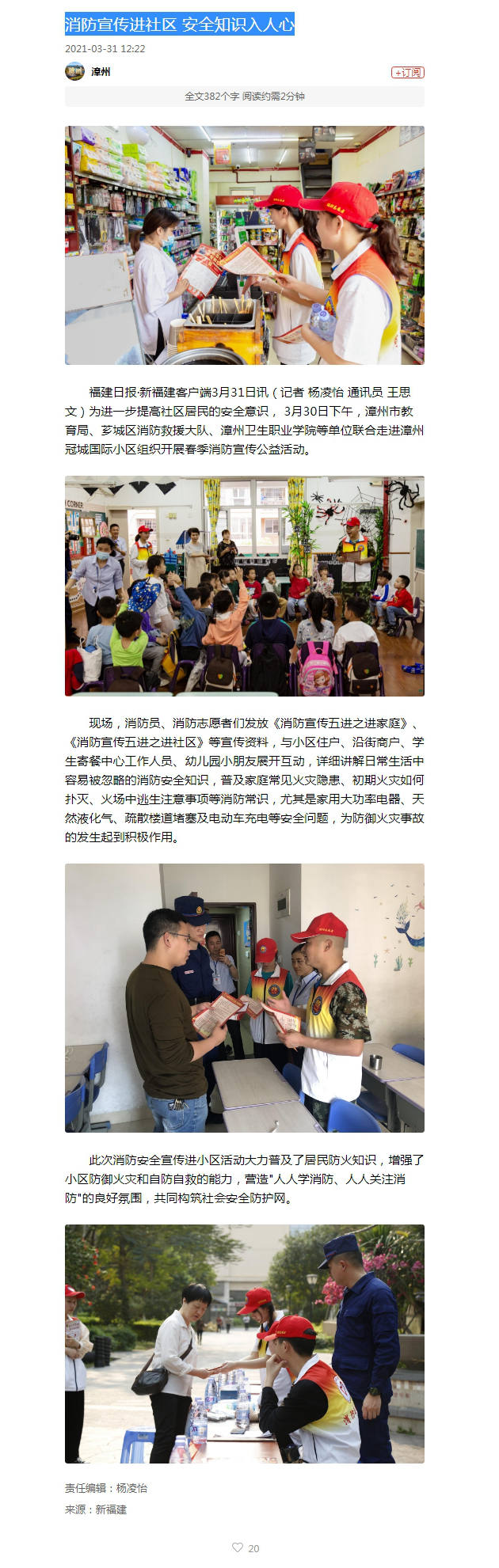 2021年3月30日上午,学院与漳州市教育局、芗城区消防救援大队联合走进漳州冠城国际小区,开展春季消防宣传公益活动被东南网、福建日报、闽南网等省级媒体报道,报道如下: