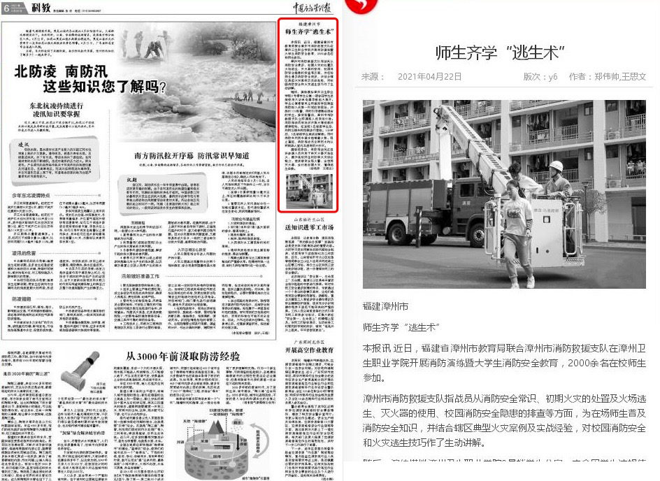本报讯近日,福建省漳州市教育局联合漳州市消防救援支队在漳州卫生职业学院开展消防演练暨大学生消防安全教育,2000余名在校师生参加。