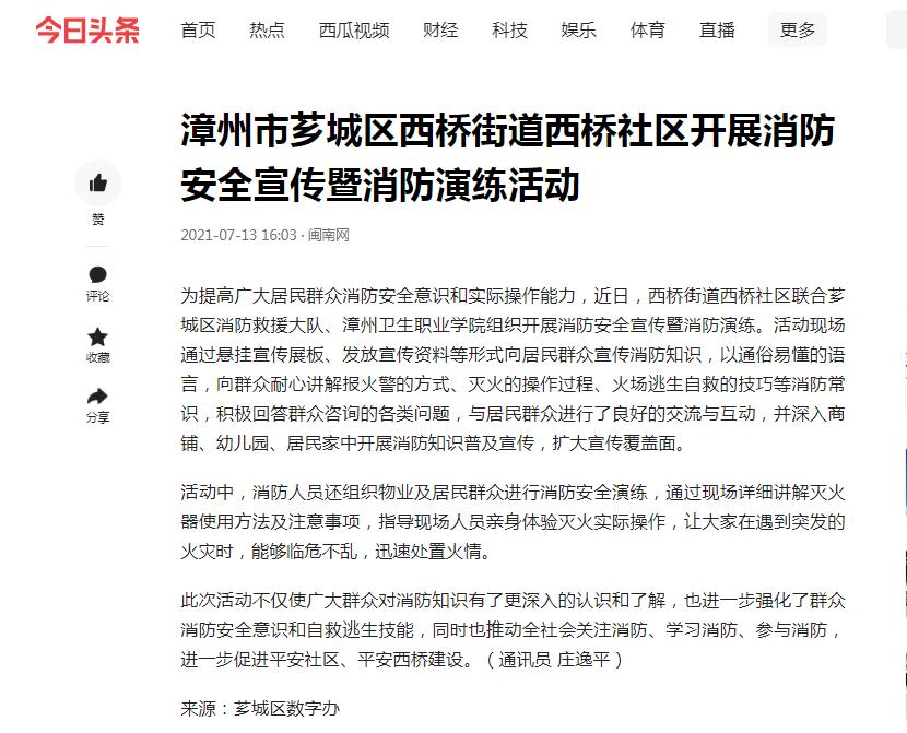 6月23日下午,漳州卫生职业学院联合芗城区消防救援大队到西桥社区开展消防宣传进社区活动,该新闻于7月13日被闽南、漳州市芗城区融媒体中心微信公众号相继报道,报道如下: