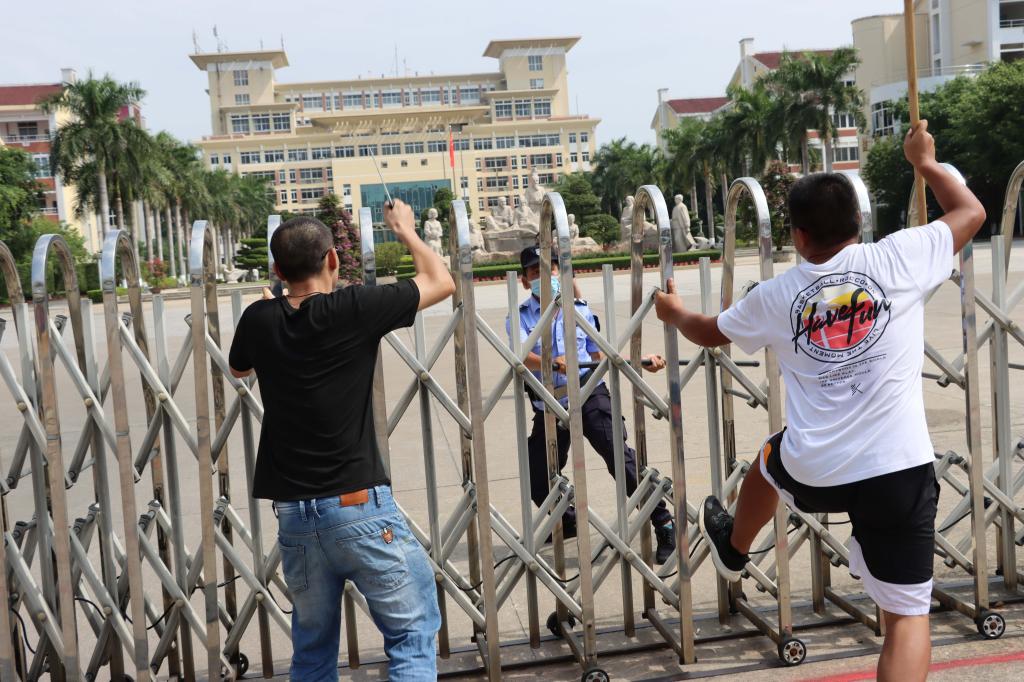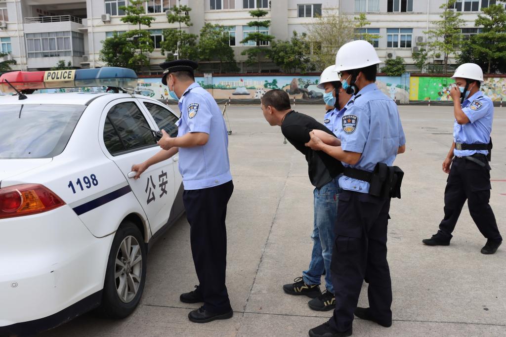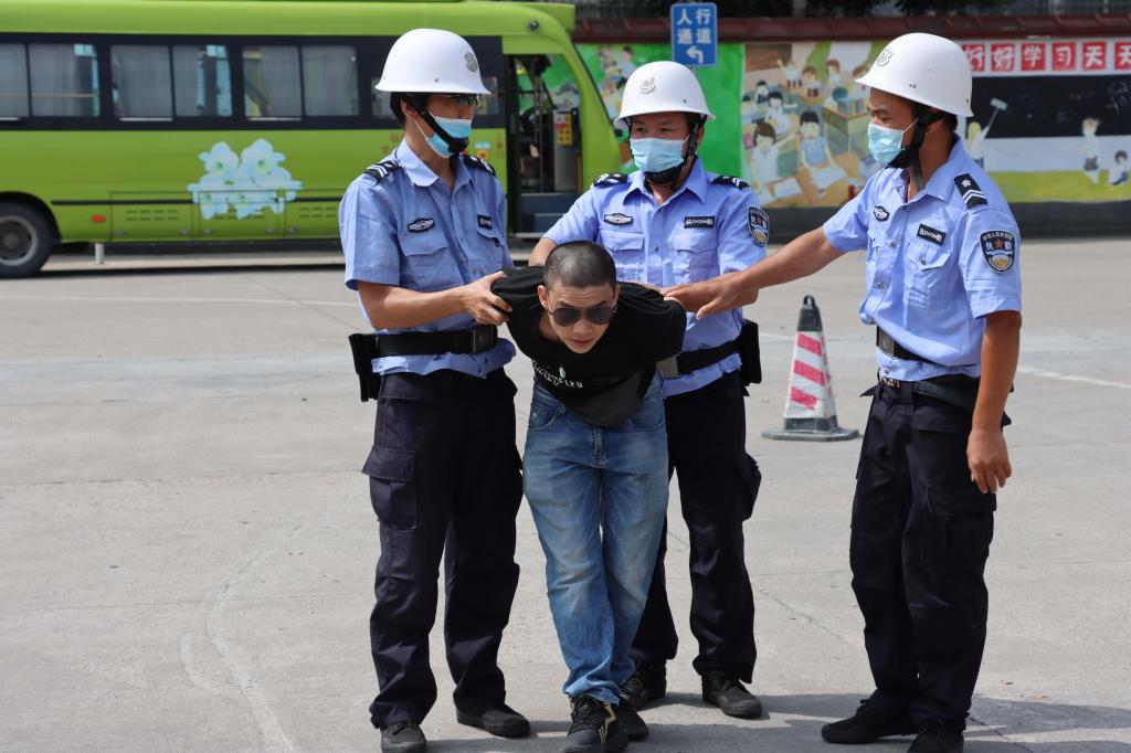 演练设置两个场景。场景一:两名“歹徒”冒充学生欲混入学校,被保安人员发现后,“歹徒”掏出刀具试图伤害保安人员,现场处置组的保安人员立即报警并迅速持防暴盾、防暴叉、铁棍与“歹徒”周旋对峙,趁“歹徒”不备夺下武器,将其制服与出警的警察一起将“歹徒”押上警车,带离校园,校园恢复原有的安宁。场景二:一名可疑人员冒充“快递员”派送快递到学校,经询问发现无此收件人,但“快递员”强行要将包裹送入,细心保安人员发现包裹疑似不明爆炸物后立即报警并报告指挥部,请求派人排爆。排爆人员到达后将可疑包裹转移至空旷地带并拆解。