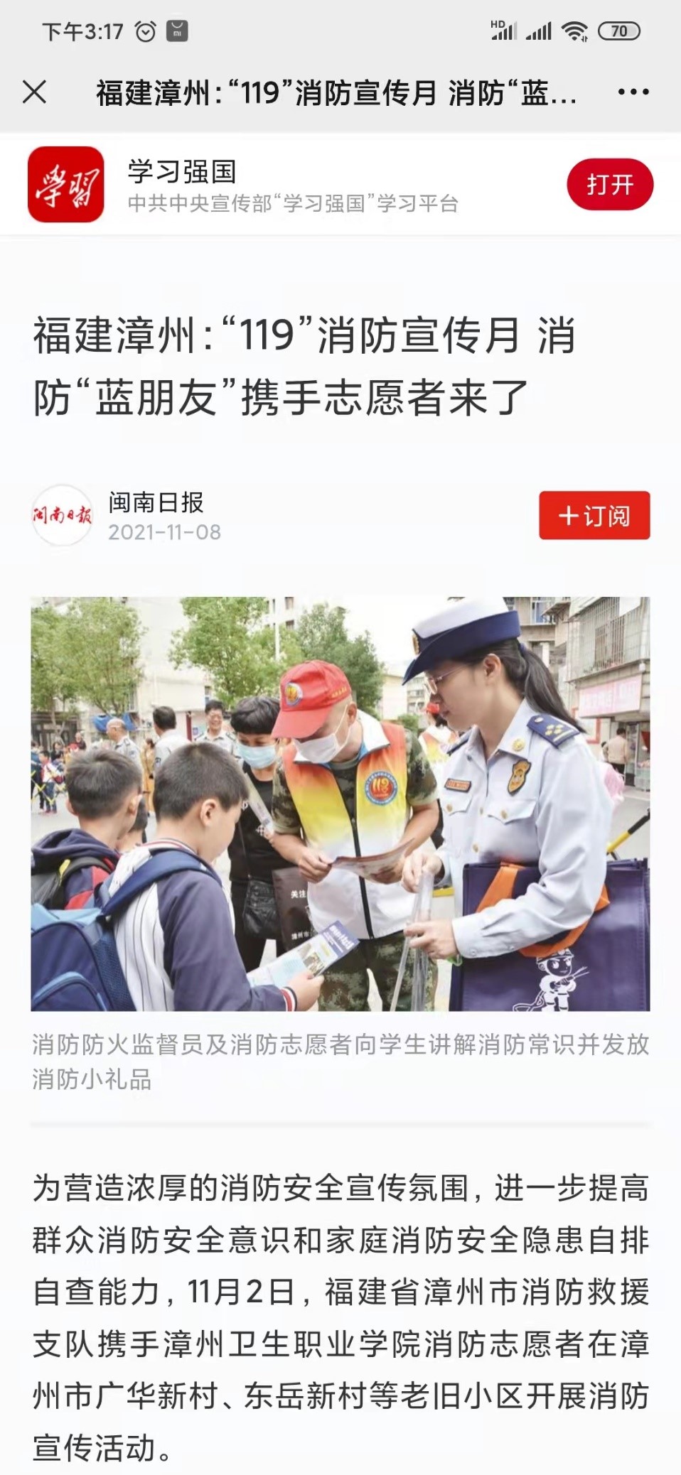 11月2日,漳州卫生职业学院与漳州消防救援支队围绕消防宣传月主题“落实消防责任,防范安全风险”,在广华新村、金冠花园、东岳新村等老旧小区开展首场消防宣传公益活动被“学习强国”推送。