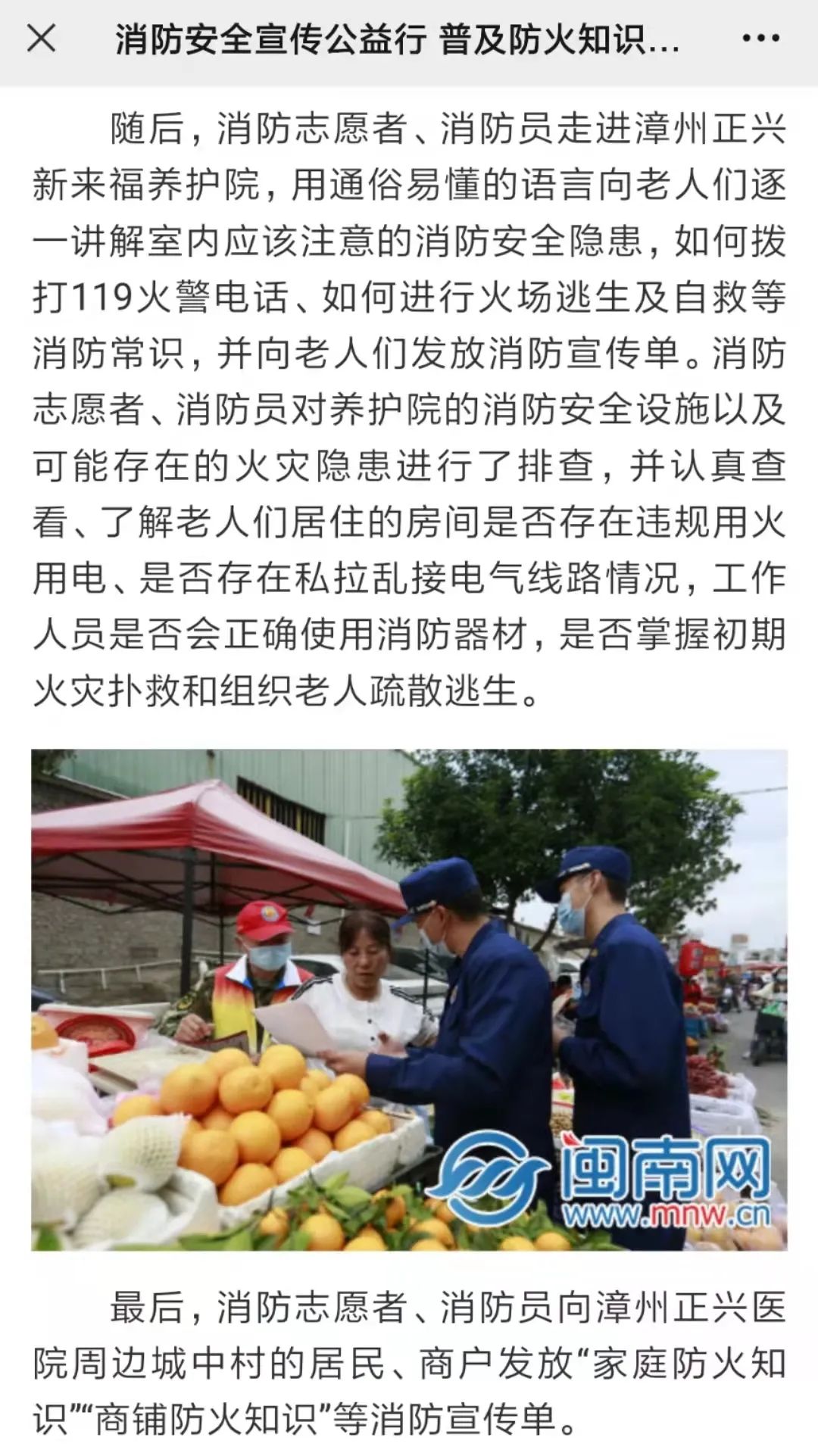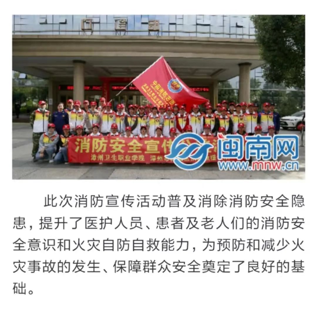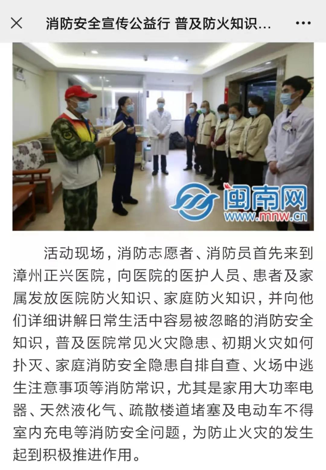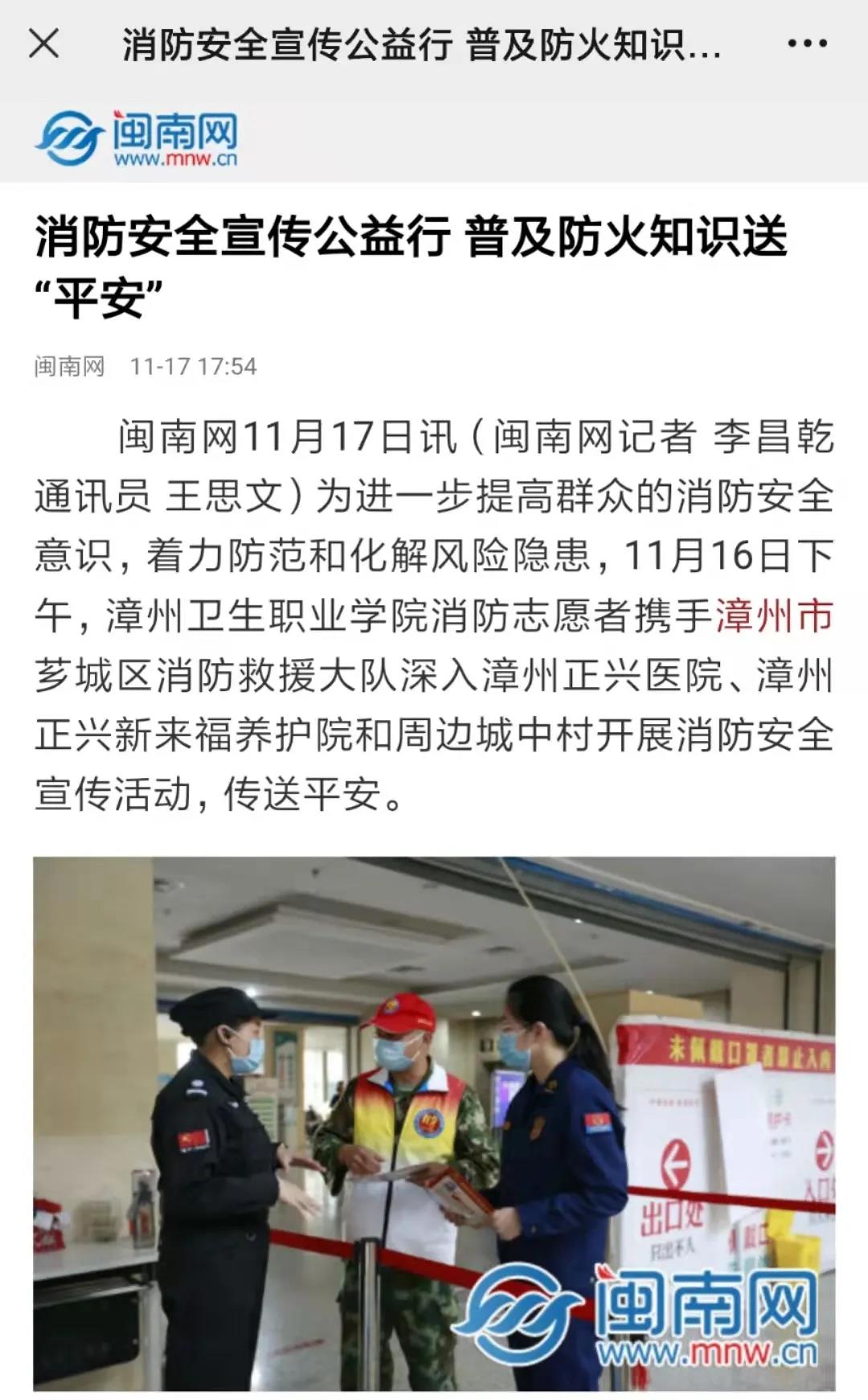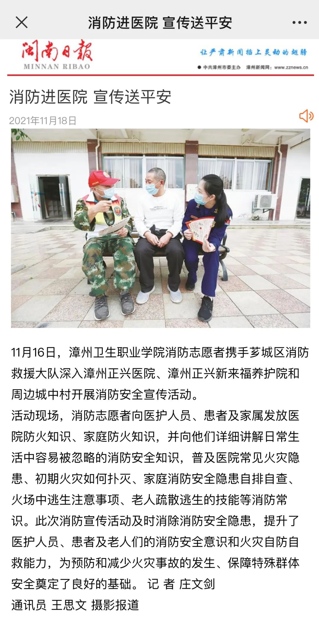 11月16日,漳州卫生职业学院消防志愿者携手芗城区消防救援大队深入漳州正兴医院、漳州正兴新来福养护院和周边城中村开展消防安全宣传活动的新闻被闽南网、闽南日报相继报道,报道如下: