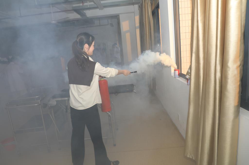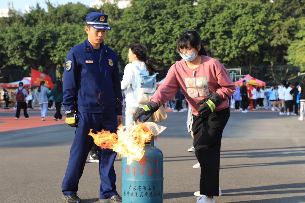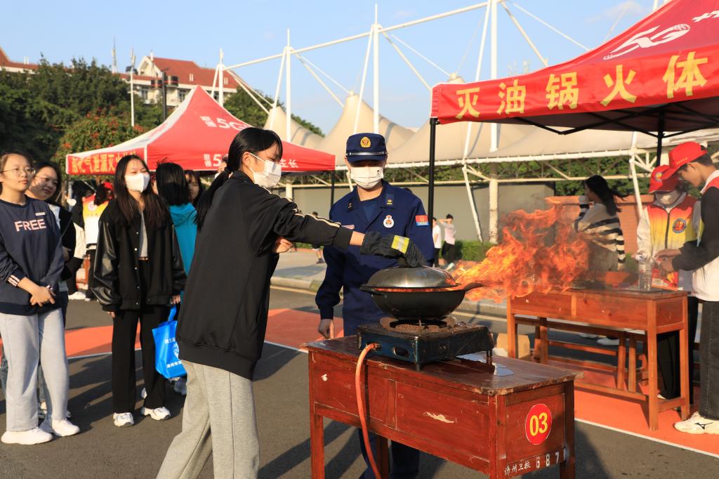 在灭火体验区,消防志愿者向现场师生讲解干粉灭火器的使用,强调要保持镇静,遇到火情千万不要惊慌失措,站在着火点上风向,保持安全距离,牢记“一晃、二拔、三压、四喷”的要领,对着火焰根部进行灭火。