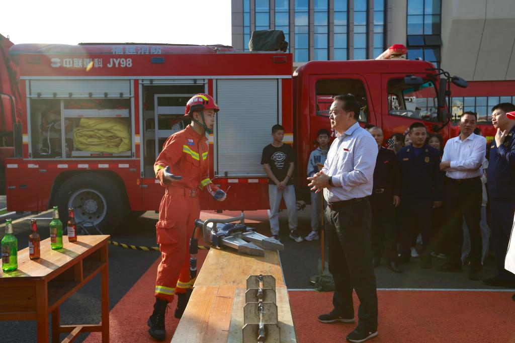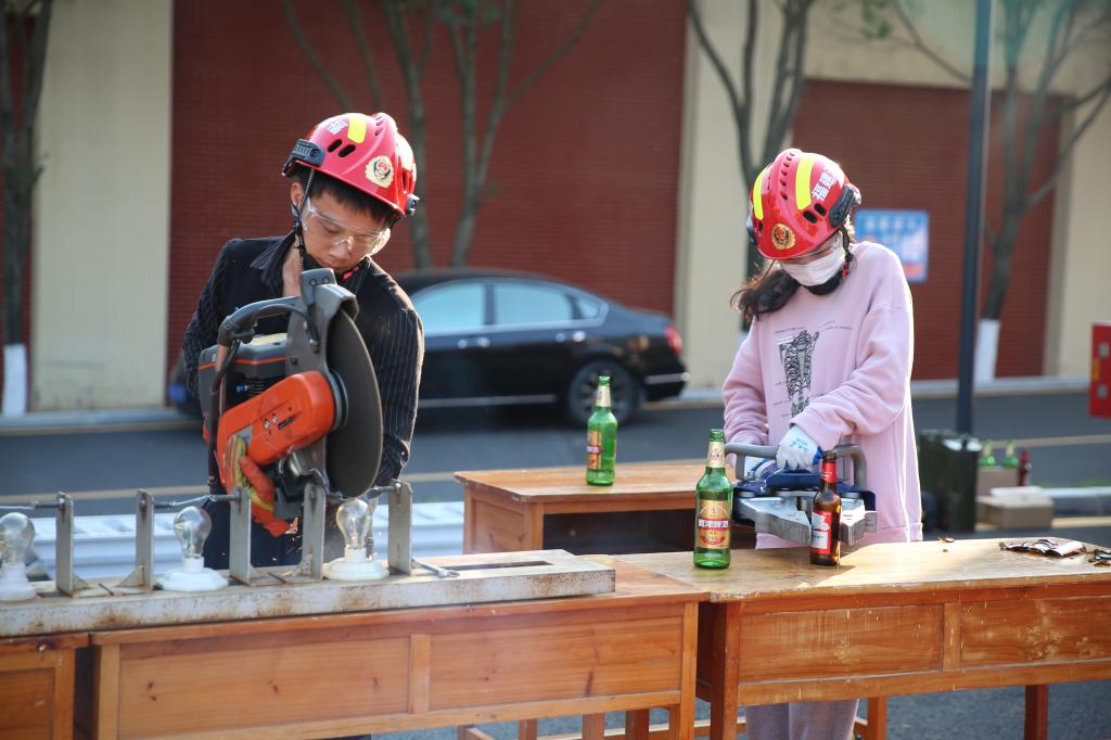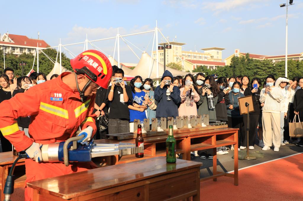 极富趣味性的 “消防知识猜谜语”和“刺激”的油锅起火扑救体验吸引了师生们浓厚的兴趣,而“火灾模拟现逃生体验屋”及“查找火灾隐患体验屋”利用逼真的模拟场景,让师生们在体验中进一步了解消防常识。“消防车辆器材装备展示及攻坚技巧演示”体验区则不时传来同学们的呼声,大家纷纷上前在消防指战员的帮助下完成了切灯泡和夹玻璃瓶等操作,过了一回消防员瘾。