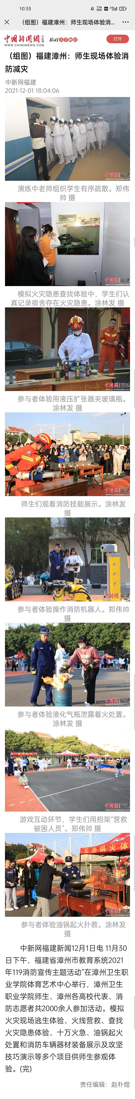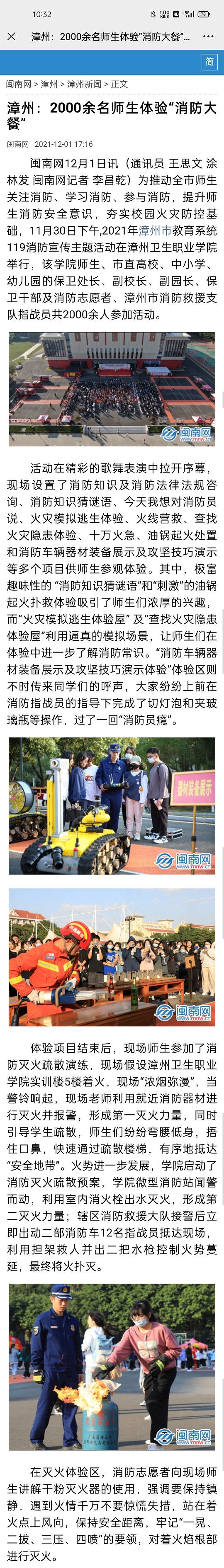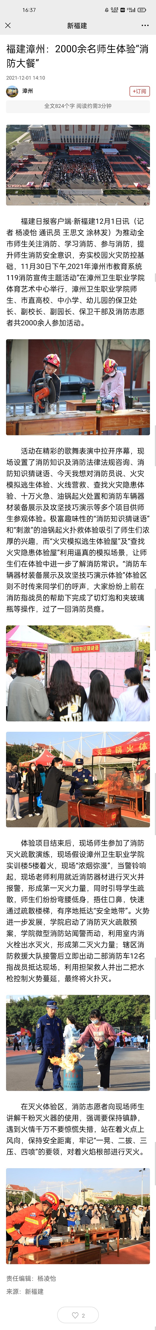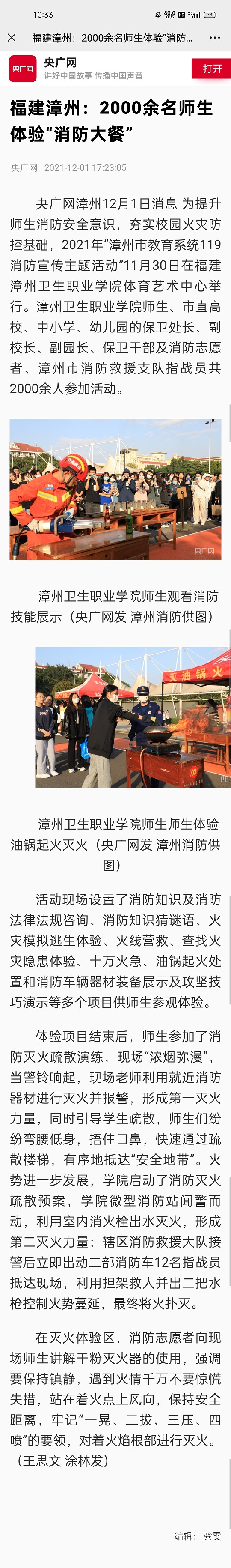 11月30日下午,由市教育局、市消防救援支队主办,芗城区消防救援大队、漳州卫生职业学院承办的2021年漳州市教育系统“119”消防宣传主题活动在漳州卫生职业学院体育艺术中心举行。漳州卫生职业学院党委副书记黄乃光、漳州市教育局副局长杜人江、漳州市芗城区消防救援大队大队长张喆、漳州市教育局学校安全工作科科长张相德、漳州卫生职业学院安全保卫处处长林碧聪出席活动。漳州市消防救援支队指战员、学院师生员工、市直高校、中小学、幼儿园的保卫处长、副校长、副园长、保卫干部及消防志愿者等2000余人参加活动。该新闻被央广网、中国新闻网、福建日报、闽南网等媒体相继报道。报道如下: