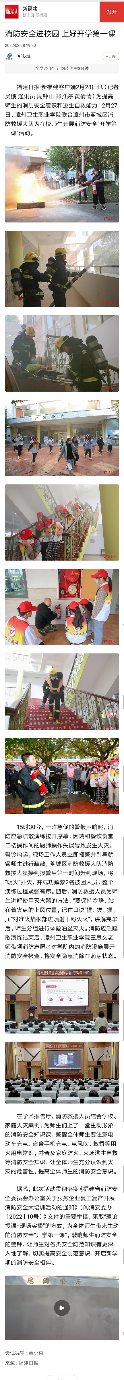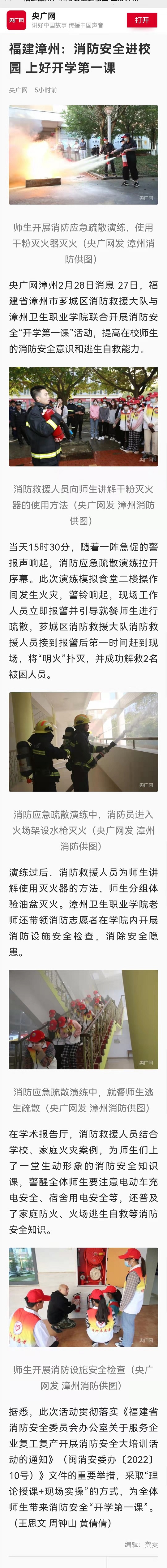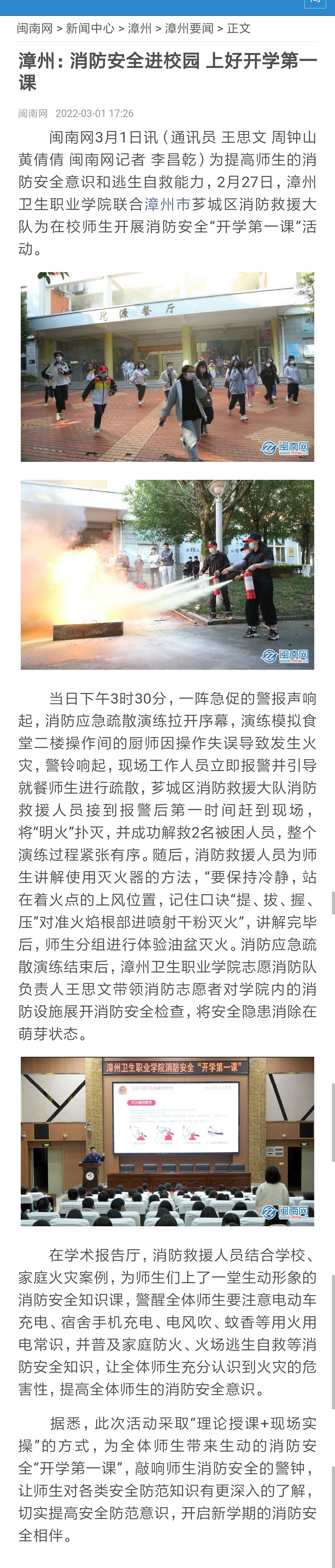 2月27日,学院与漳州市芗城区消防救援大队联合开展消防安全“开学第一课”活动,提高在校师生的消防安全意识和逃生自救能力,该新闻相继被央广网、福建日报 新福建、闽南网报道,报道如下: