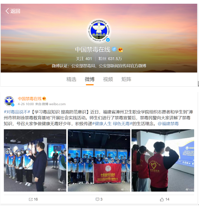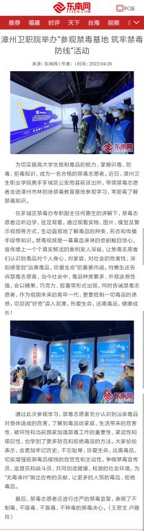 为切实提高大学生抵制毒品的能力,掌握识毒、防毒、拒毒知识,成为一名合格的禁毒志愿者。近日,漳州卫生职业学院携手芗城区公安局县前派出所,带领禁毒志愿者走进漳州市林则徐禁毒教育基地参观学习,零距离了解禁毒知识,该新闻相继被东南网、中国禁毒在线微博报道。