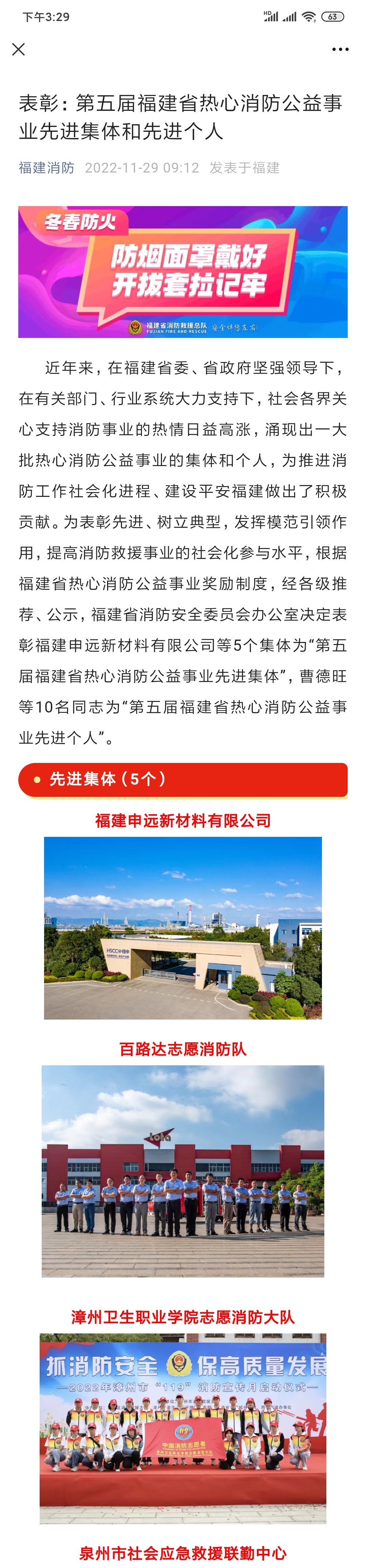 为表彰先进、树立典型,发挥模范引领作用,提高消防救援事业的社会化参与水平,根据福建省热心消防公益事业奖励制度,经各级推荐、公示,11月28日,福建省消防安全委员会办公室决定表彰5个“第五届福建省热心消防公益事业先进集体”,10位“第五届福建省热心消防公益事业先进个人”。学院志愿消防大队荣获“第五届福建省热心消防公益事业先进集体”称号。