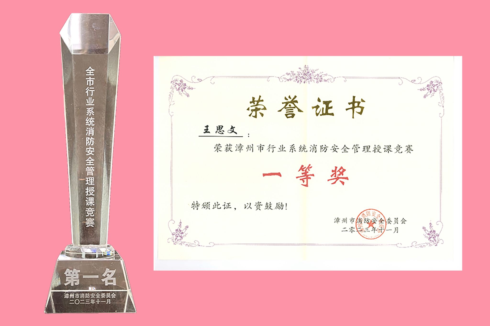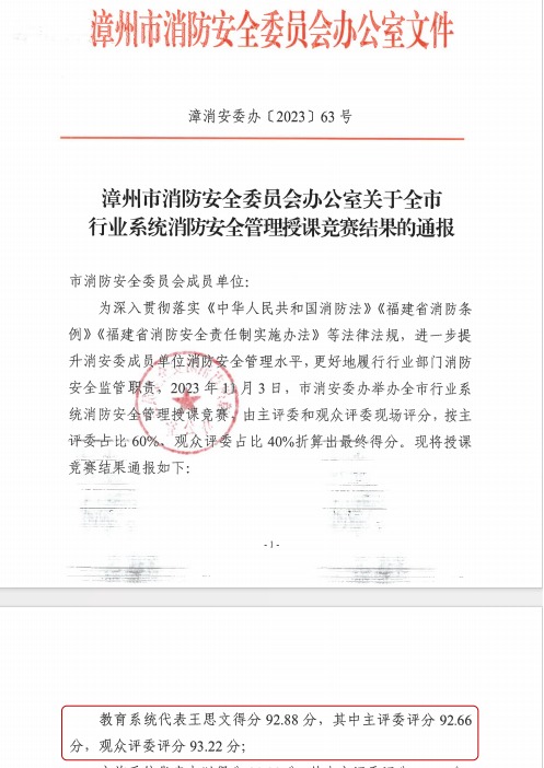 近日,我校王思文同志代表教育系统参加由漳州市消防安全委员会举办2023年全市消防安全宣传教育培训比武竞赛,并荣获“漳州市行业系统消防安全管理授课竞赛”一等奖。