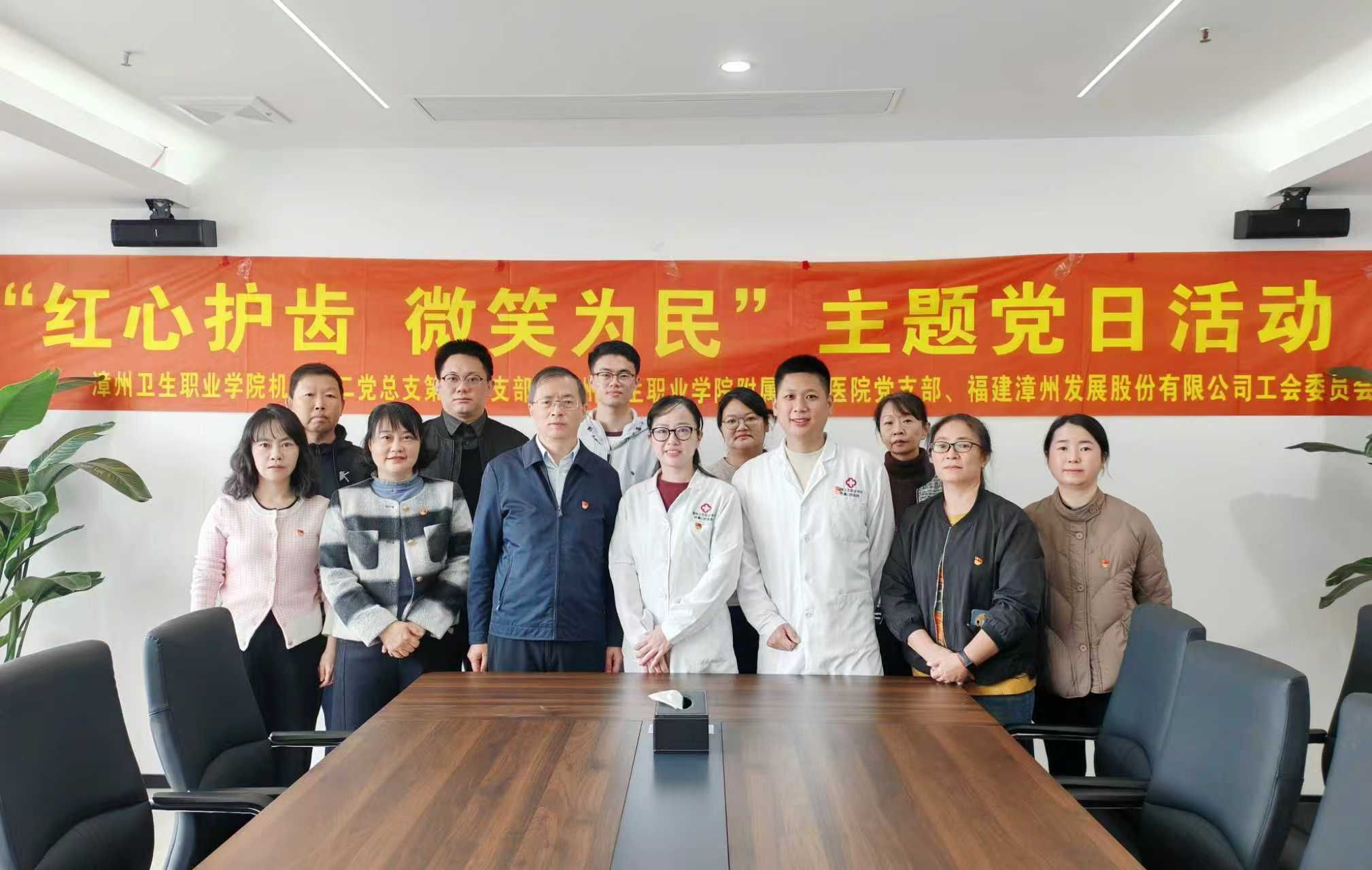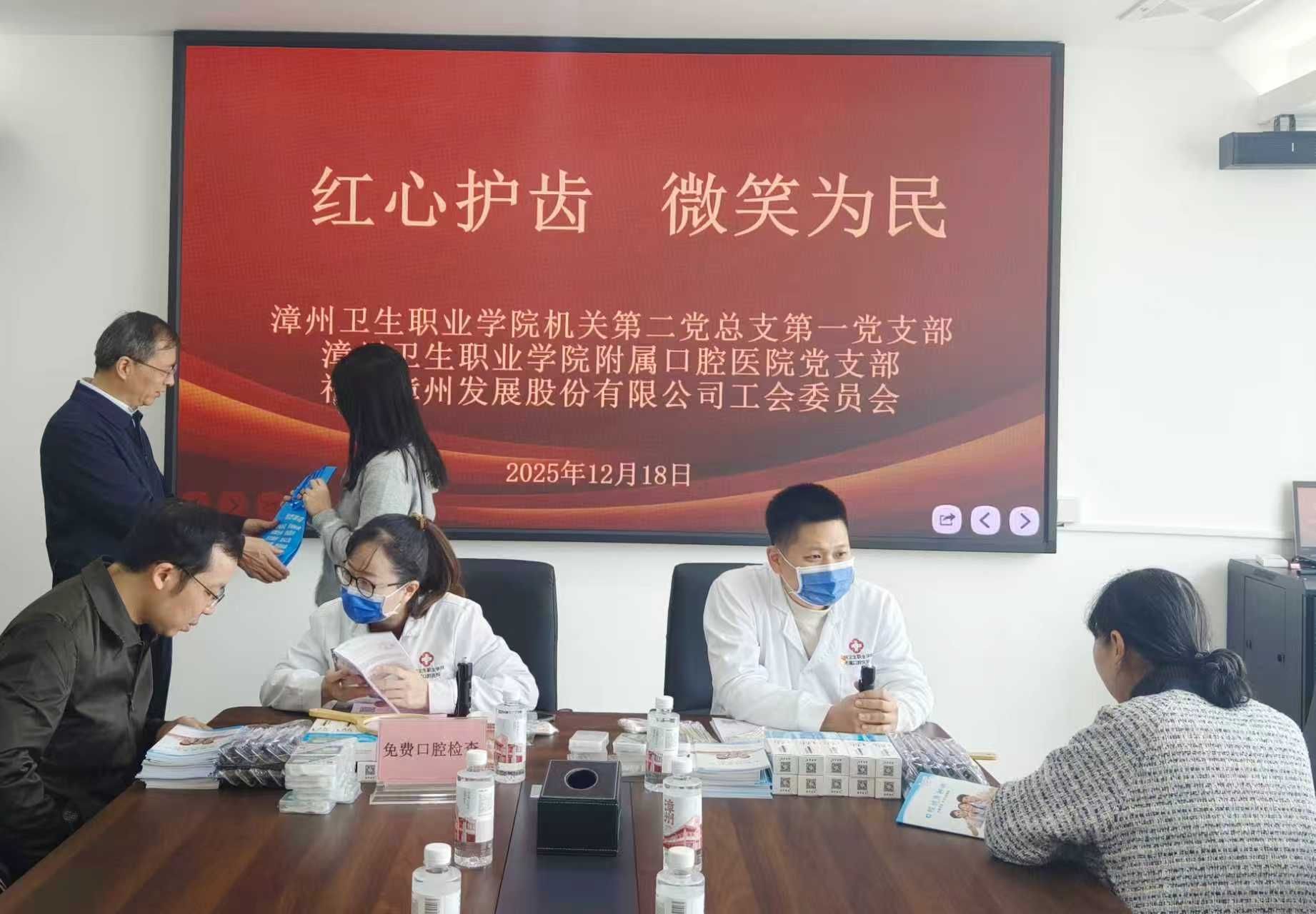2025年12月18日,我校机关第二党总支第一党支部与附属口腔医院党支部,携手漳州发展股份有限公司工会委员会,共同开展“红心护齿•微笑为民”主题党日活动,为该公司广大职工送上温暖而专业的口腔健康服务。