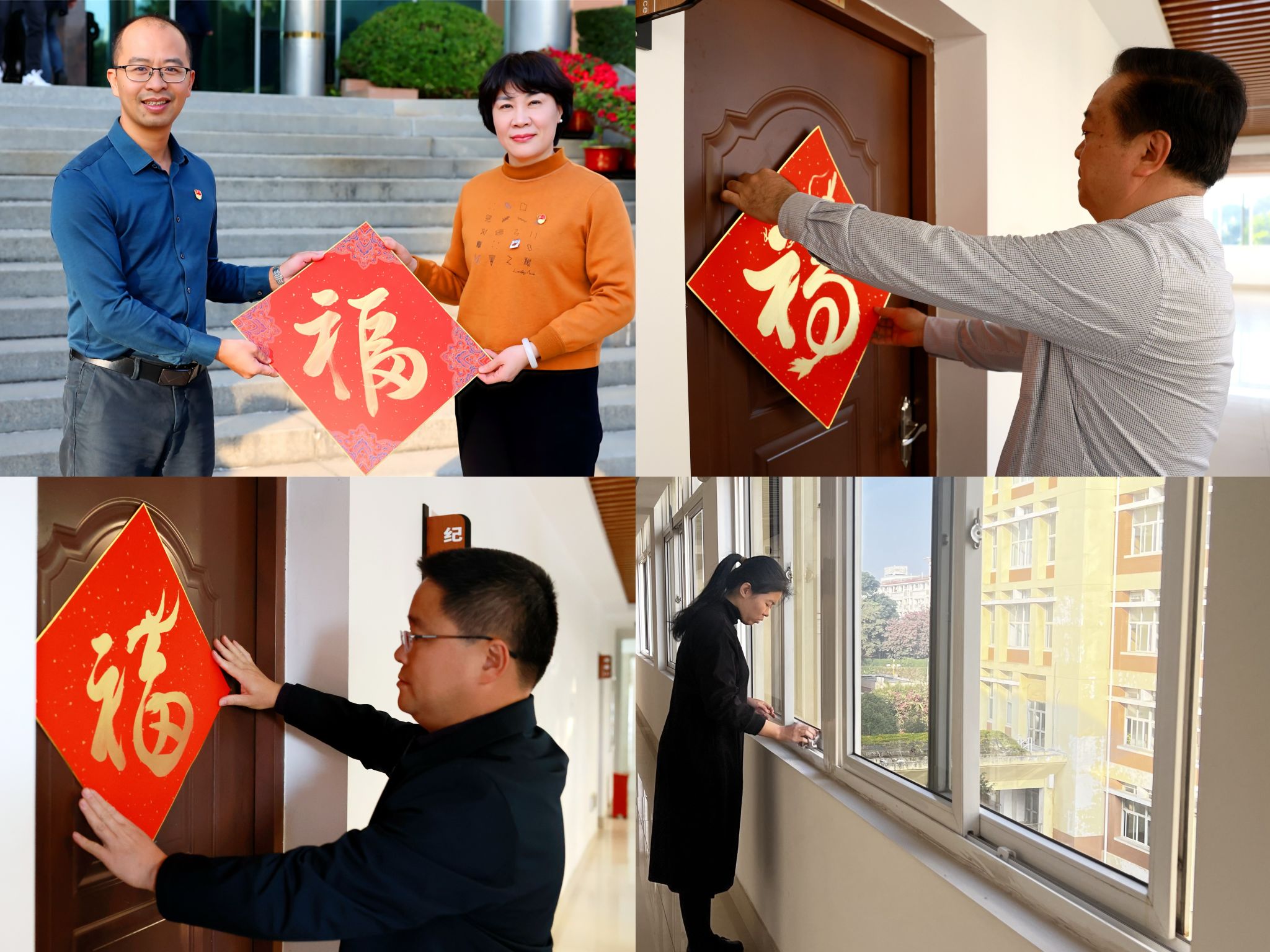 全体党员热情高涨,拿起扫帚、拖把、抹布等工具对行政楼各楼层楼道、窗户等进行清扫。打扫结束后,校领导给部门负责人赠“福”、贴“福”,将蕴含着喜庆和祝福的“福”字传递,营造欢乐喜庆、温馨和谐的氛围。