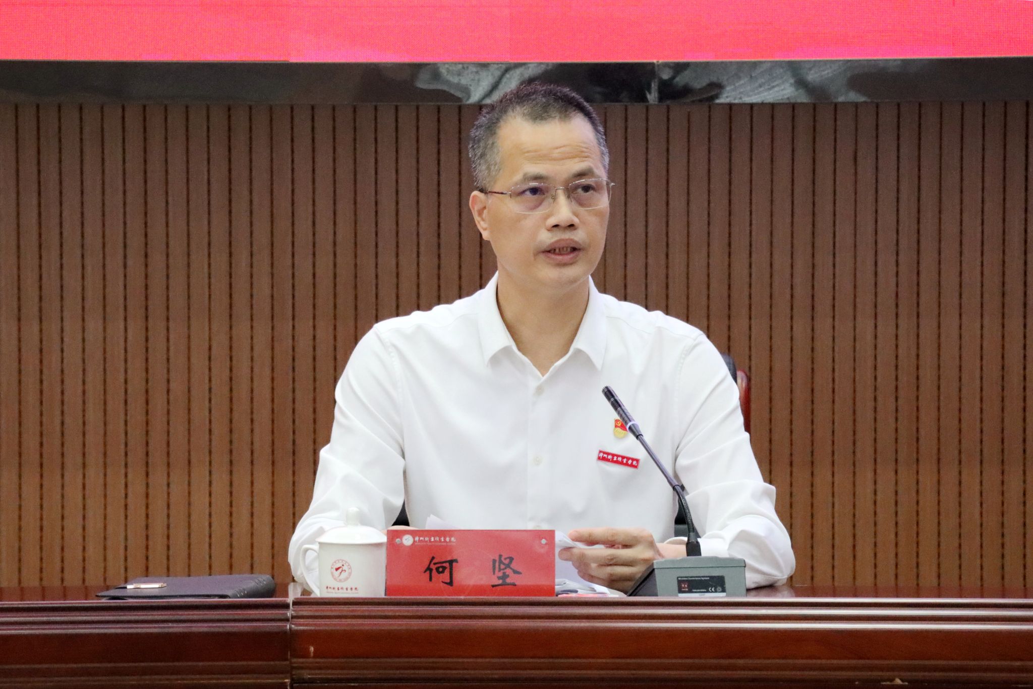 何坚代表学校领导班子作2023年度工作总结及干部选拔任用工作报告,学校领导班子成员进行书面述职。