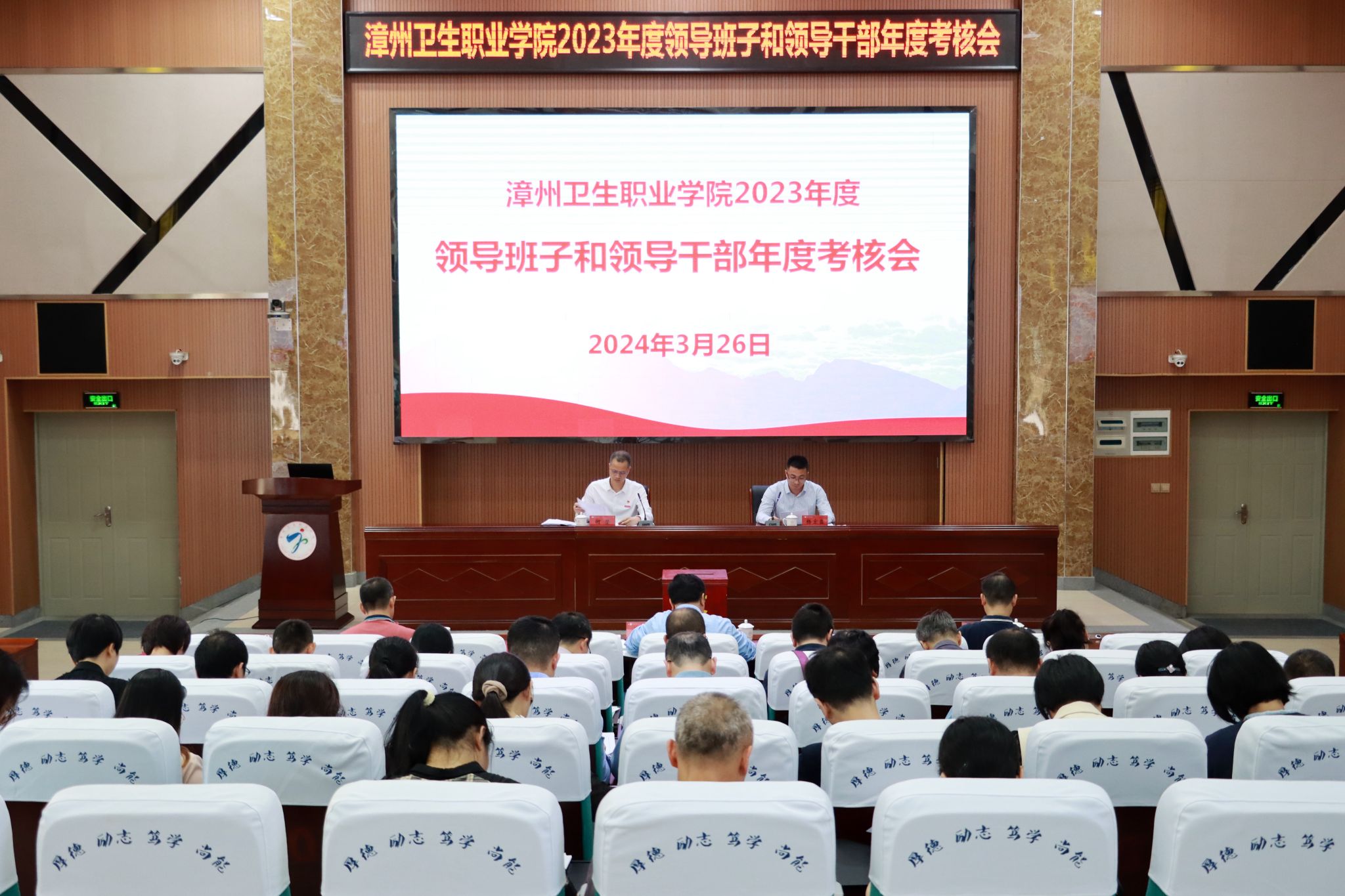 3月26日上午,我校在学术报告厅召开2023年度领导班子和领导干部考核暨干部选拔任用“一报告两评议”工作会议。市委高校干部考核组、市委组织部干教科科长杨宏益一行3人到会考核指导,会议由学校党委副书记、校长何坚主持。