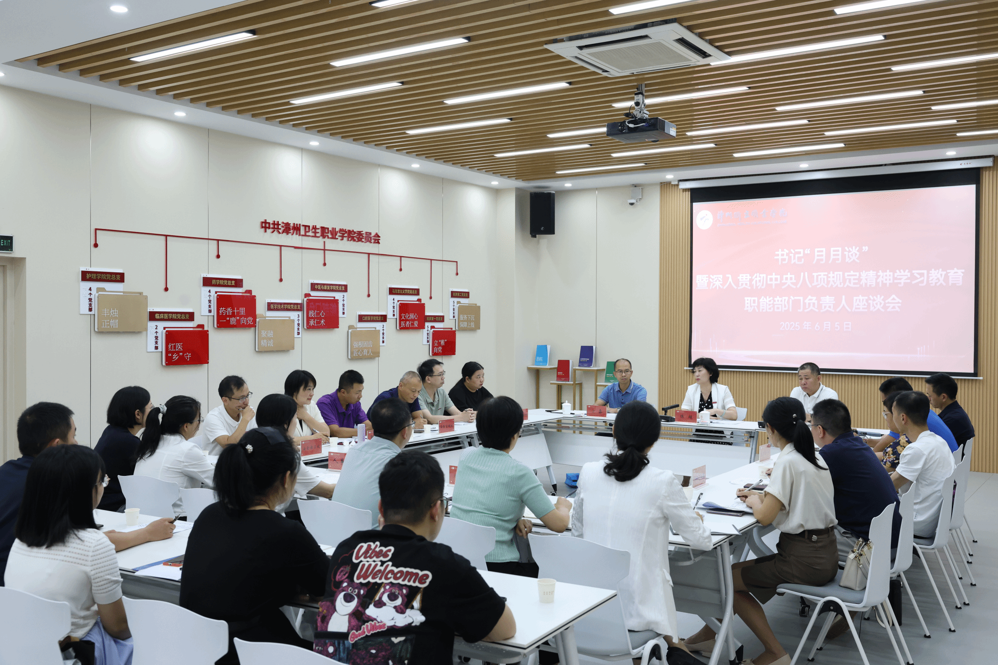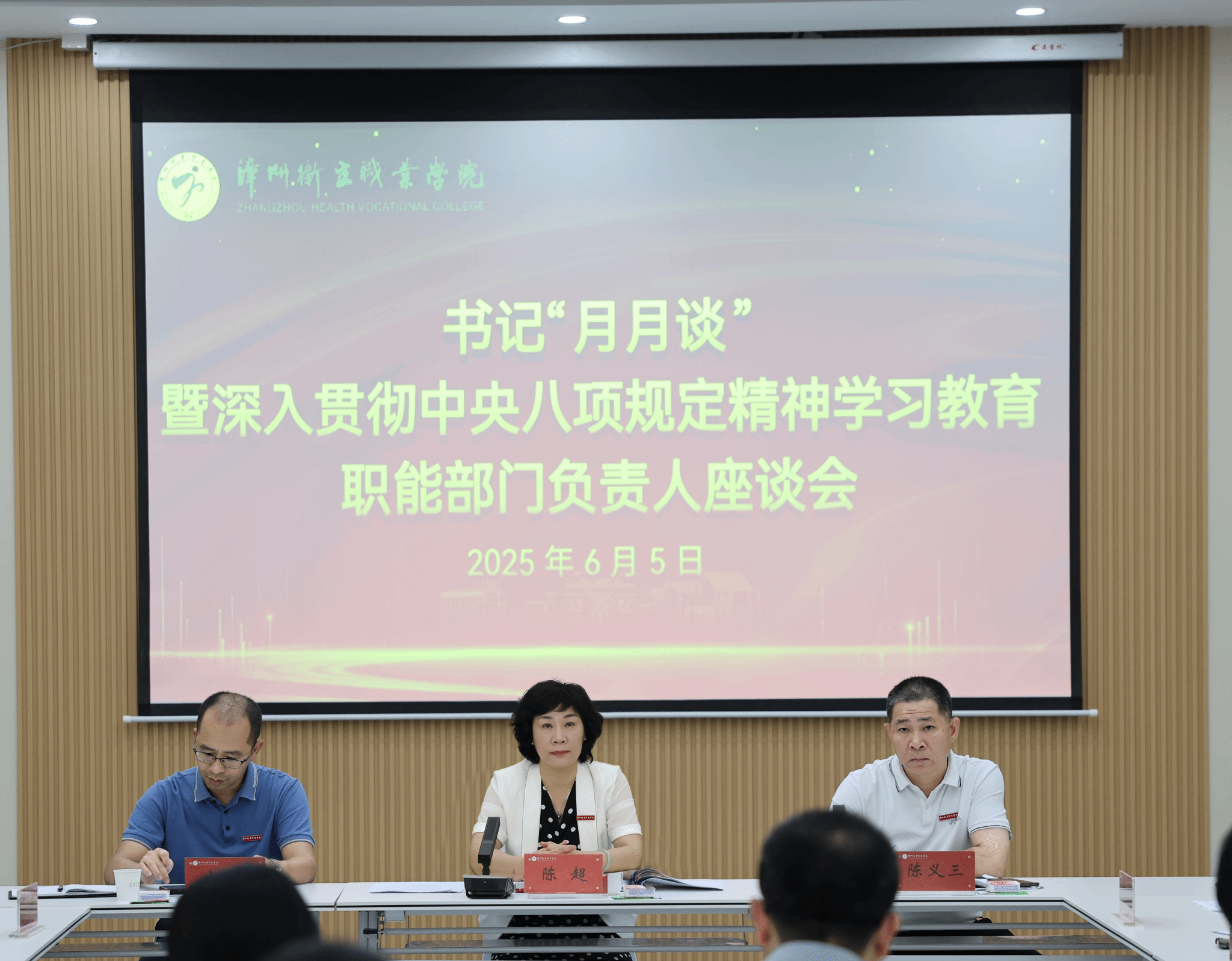 6月5日,我校在智慧党建展示厅召开书记“月月谈”暨深入贯彻中央八项规定精神学习教育职能部门负责人座谈会。党委书记陈超出席会议,副校长陈义三主持会议。