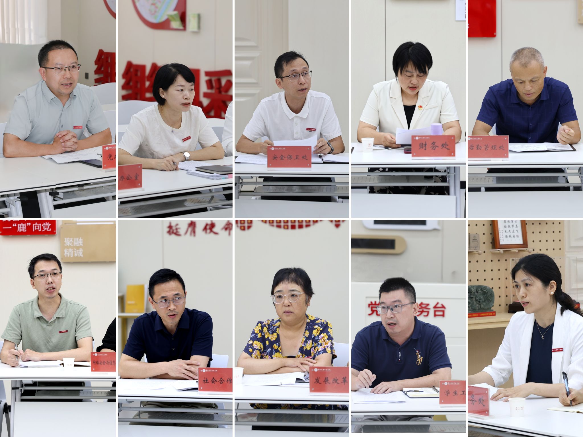 党政办公室、人事处(教师工作部)、安全保卫处、财务处、后勤管理处、网络安全与信息化办公室、社会合作处、发展改革处、学生工作部、教务处等10个部门的正副职人员参会。