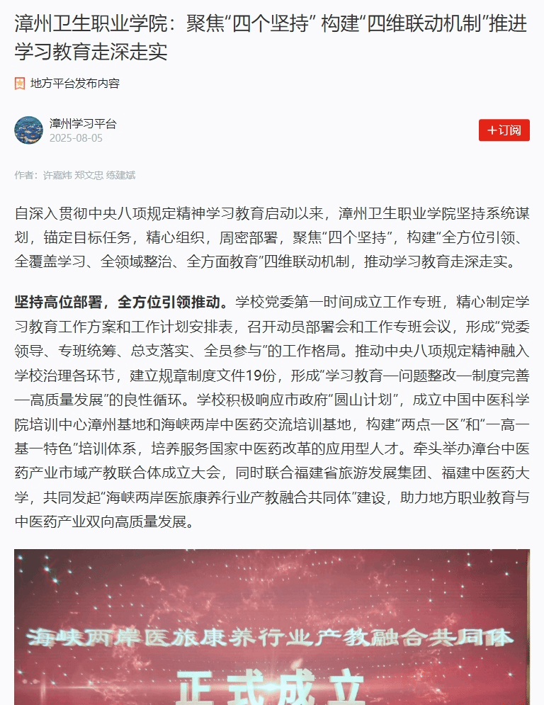 漳州卫生职业学院:聚焦“四个坚持” 构建“四维联动机制”推进学习教育走深走实