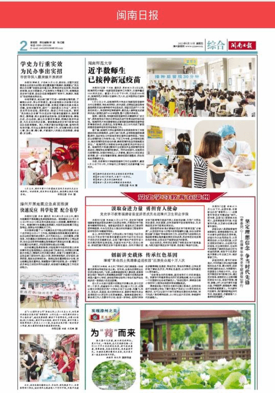 一、2021年5月13日,《闽南日报》刊发题为《汲取奋进力量勇担育人使命——党史学习教育福建省委宣讲团成员走进漳州卫生职业学院》的报道。内容如下: