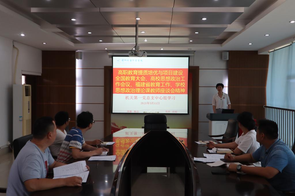 5月11日下午,机关第一党总支在行政楼四楼会议室召开理论中心组学习会议,专题学习高职教育提质培优与项目建设、全国教育大会、高校思想政治工作会议、福建省教育工作会、学校思想政治理论课教师座谈会精神,会议由党总支书记主讲。