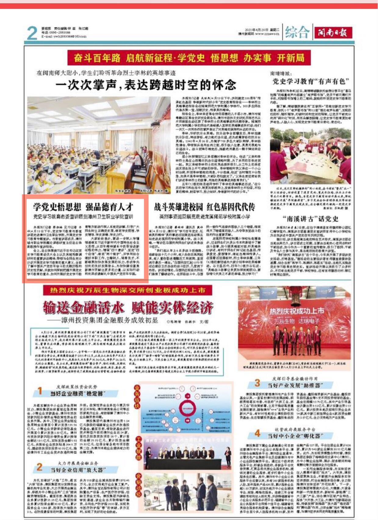 一、2021年4月20日,《闽南日报》发表题为《学党史悟思想 强品德育人才——党史学习教育市委宣讲团到漳州卫生职业学院宣讲》的文章。报道如下: