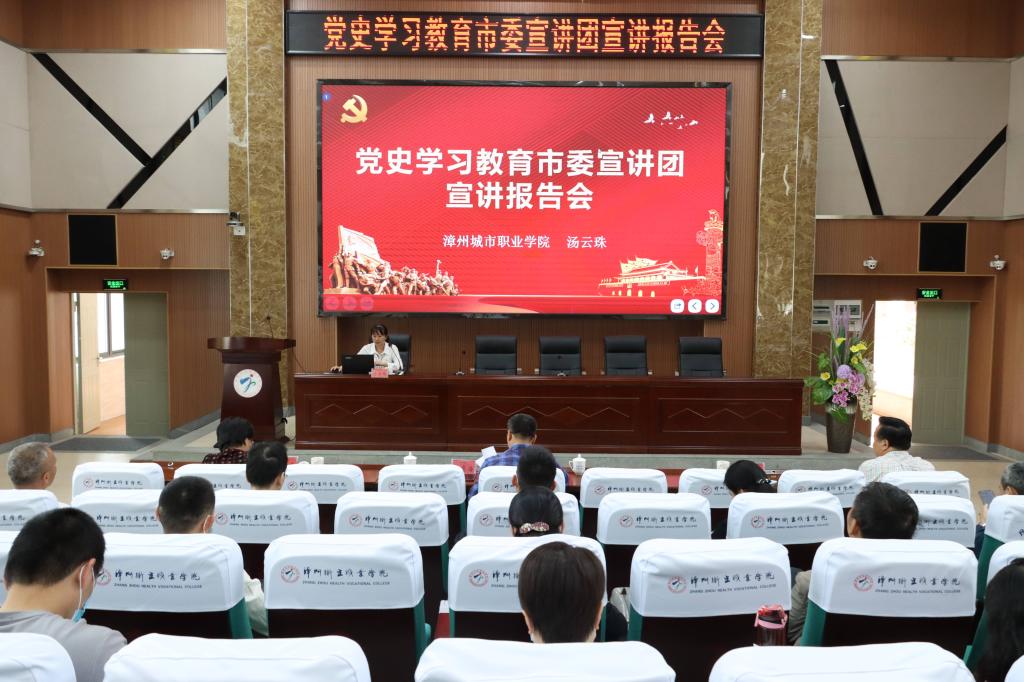 4月19日下午,党史学习教育市委宣讲团走进我院,开展党史学习教育专题宣讲暨党委理论学习中心组扩大会。市委宣讲团成员、漳州城市职业学院汤云珠副教授主讲,我院党委副书记黄乃光主持,学院副科级及以上干部、辅导员、思政课教师及学生代表参加了宣讲会。