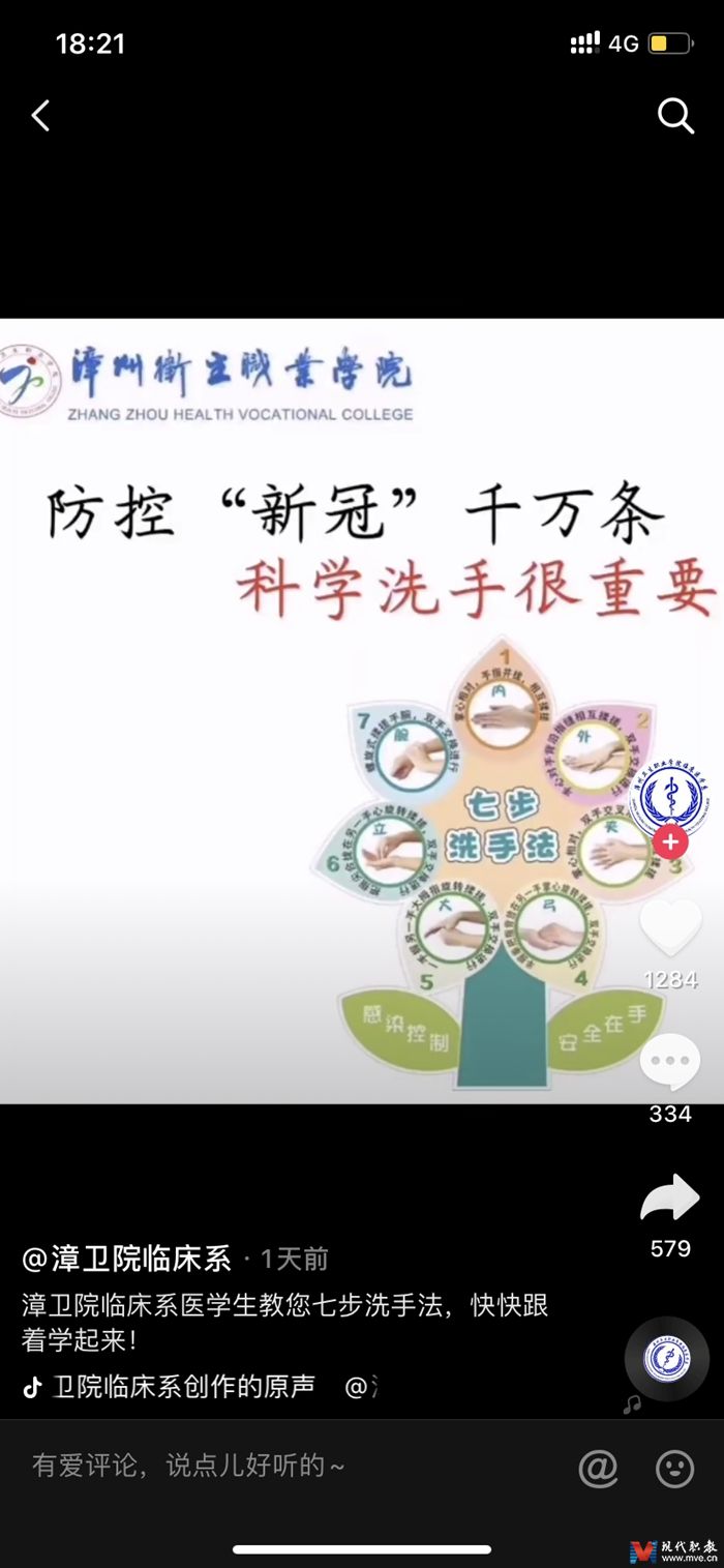 “内、外、夹、弓、大、立、腕”,这是漳州卫生职业学院临床医学系的学生在家拍摄的系列宣教视频之一——“七步洗手法”,视频上传至抖音等线上平台,24小时内点击量达到1.8万,很好地为公众普及日常防疫手段。教师们还编制出具有“漳卫”特色的网络版预防手册,从日常饮食、生活起居、情志调摄、药膳调理、居家运动等方面,为群众提供既专业又接地气的日常预防保健攻略。此外,学院还迅速在全院招募医学专业青年教师和学生,成立青年突击预备队,开展科普宣传、信息跟踪等防控工作,为打赢疫情防控阻击战贡献力量。