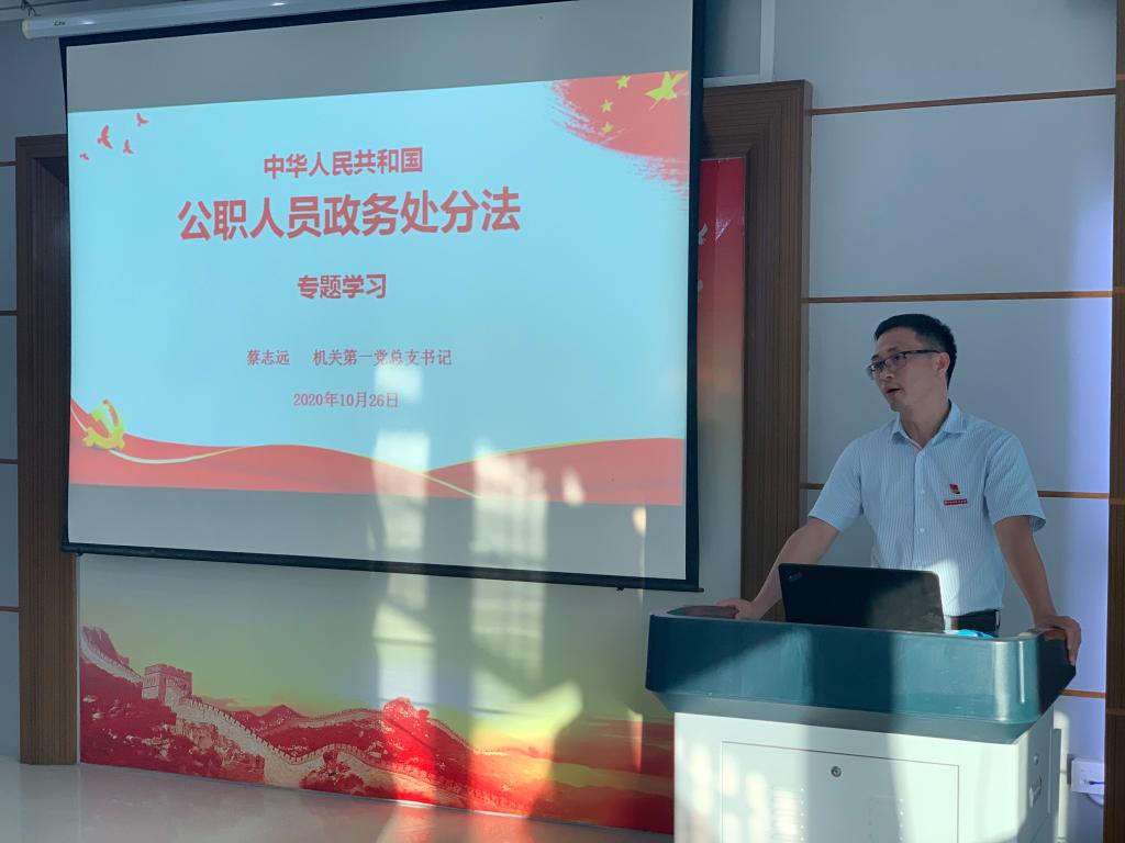 10月26日下午,机关第一党总支于行政楼四楼会议室组织全体党员开展《中华人民共和国公职人员政务处分法》专题学习会议。此次会议由总支书记为党员们一一解读。