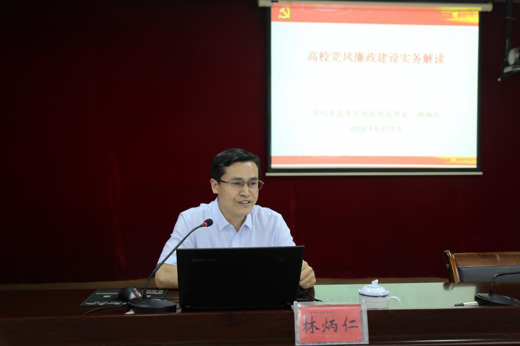 6月21日下午,我院召开2018年第6次党委理论中心组学习会议,邀请市纪委监委党风政风监督室林炳仁主任作《高校党风廉政建设实务解读》专题讲座,学院党委理论学习中心组成员、副科级及以上干部、纪检委员参会,会议由学院纪委书记宋志海主持。