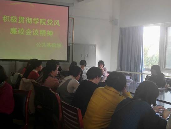 为深入贯彻党的十九大、十九届中央纪委会议精神,落实学院党风廉政建设工作部署,3月27日公共基础部在明诚楼307召开2018年党风廉政建设专题学习会,全系教师参加学习,会议由基础部党总支书记主持。