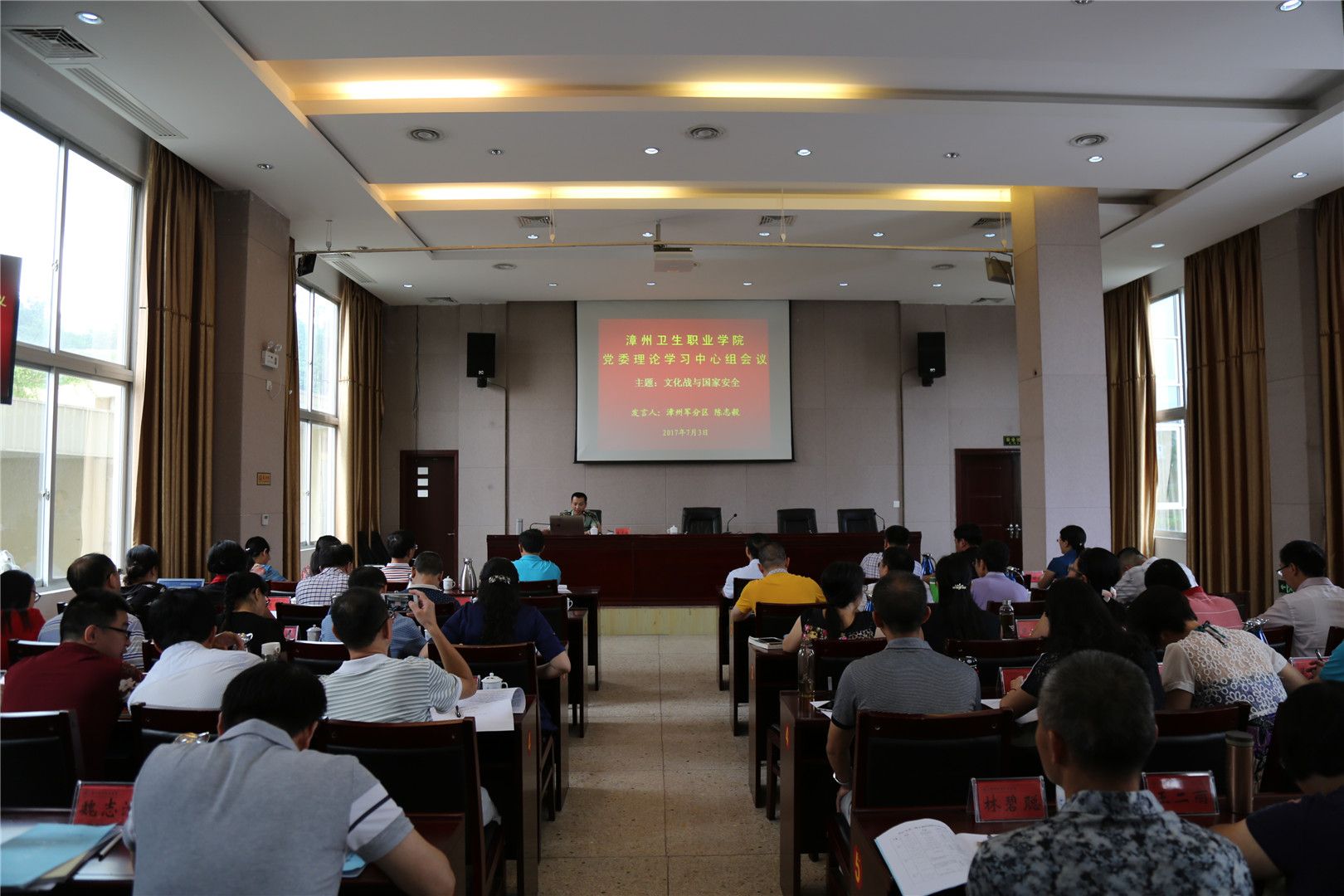 7月3日上午,我院党委理论学习中心组在长泰县委党校召开学习扩大会,邀请漳州军分区陈志毅同志作《文化战与国家安全》专题报告会。会议由我院纪委书记宋志海主持,全体正科级以上干部参加本次报告会。