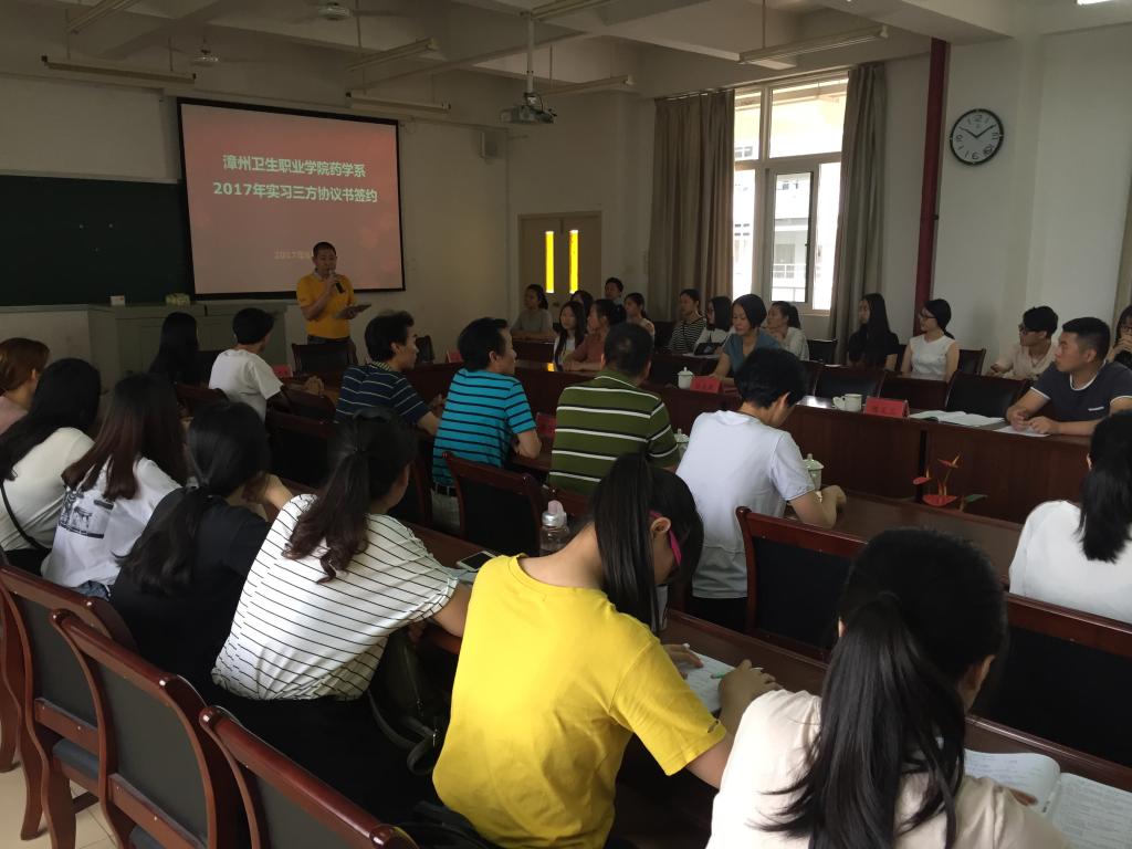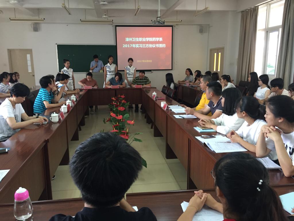 6月8日,药学系在致远楼309会议室举行实习三方协议书签订仪式。系党总支书记、系党总支副书记、聚善堂(福建)医药集团有限公司、漳州鹭燕医药有限公司等企业代表出席签约仪式。相关实习队长及部分实习生代表参加仪式。 系党总支副书记作为校方代表与企业代表、实习队长签订实习三方协议书后,系党总支书记表示,希望校企合作单位能多参与院系教学活动,共同制定符合现代职场需求的人才培养方案,达到校企双赢的目的。同时,他强调实习生们在实习过程中除了要继续学习、巩固专业知识外,还要学会人际沟通,培养情商。