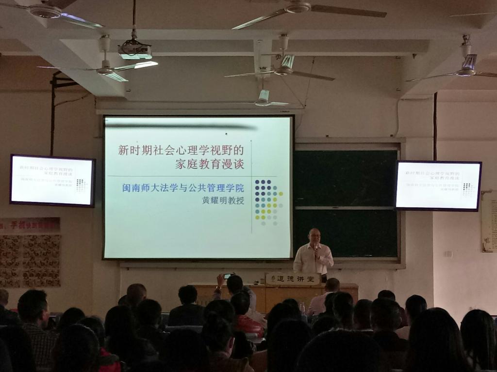 为把家庭教育与学校教育、社会教育紧密结合起来,帮助和引导家长树立正确的家庭教育观念,掌握科学的家庭教育方法,提高家长教育水平,有效促进孩子综合素质的提高,12月11日下午3时,闽南师范大学法学与公共管理学院副院长黄耀明教授应护理系邀请,在明德楼2教展开了一场题为《新时期社会心理学视野的家庭教育漫谈》的讲座。护理系领导、家长委员会代表、学生家长、辅导员、教师以及学生代表参加了本场讲学活动。