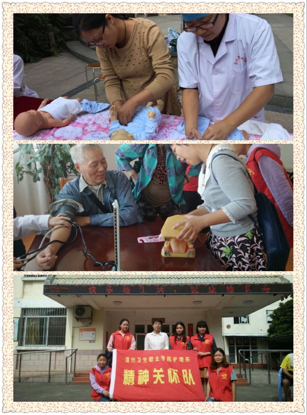 11月6日上午,护理系专业服务队兵分两路,生活护理队、精神关怀队到漳州市福利院,关爱孕产妇队到永鸿公倌分别开展 “心手相牵 健康同行”社会服务活动。