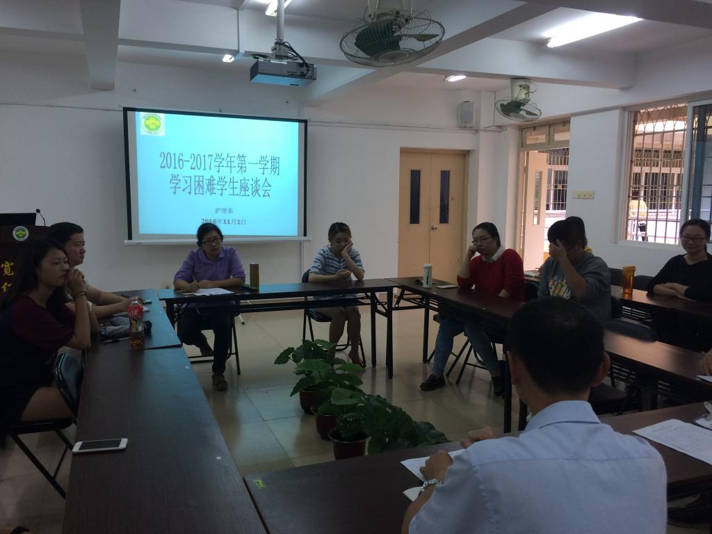 11月1日下午,护理系召开2016-2017学年第一学期学习困难学生座谈会,护理系副主任主持召开了本次会议,教学秘书以及2015级护理和助产专业学习困难学生和帮扶教师参加了此次座谈会。