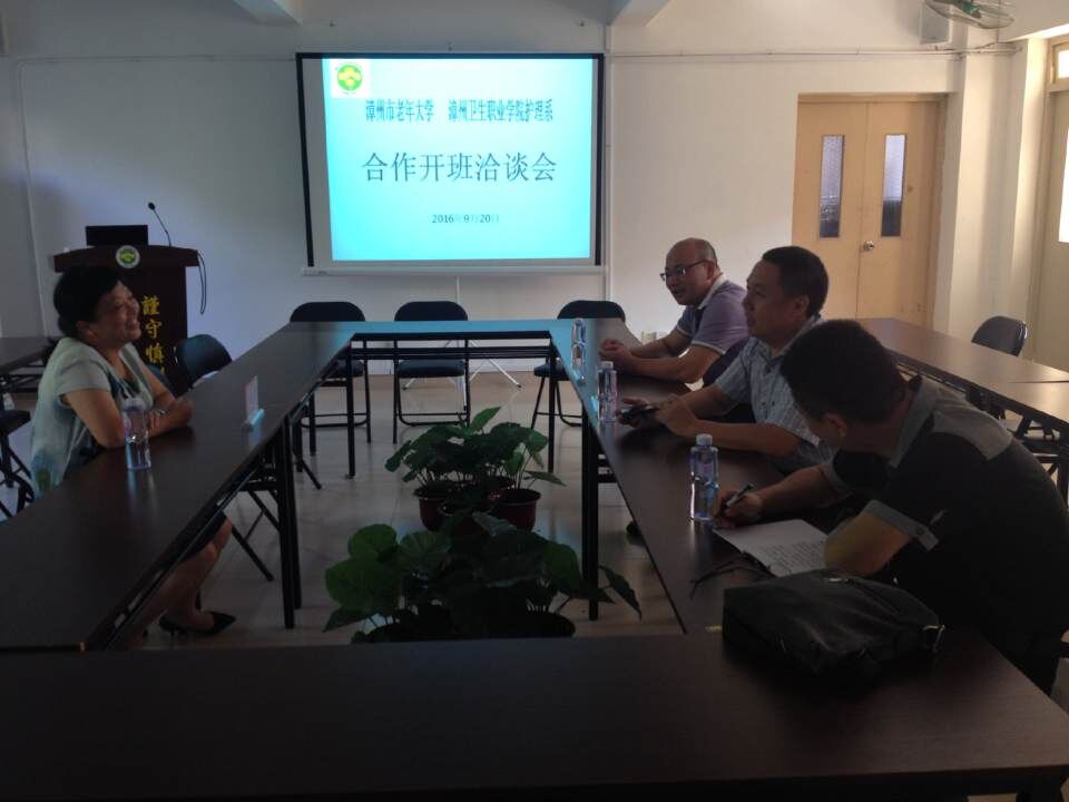 9月20日上午,漳州市老干局副局长、漳州老年大学常务副校长赵作泉,漳州老年大学专职副校长林颖刚及漳州老年大学办公室领导一行莅临护理系,寻求合作办班机会。护理系主任参与洽谈。