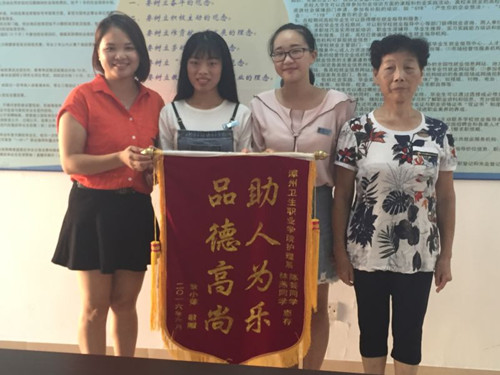 6月4日中午12:30左右,在芗城区世纪广场发生了一起交通事故,一位3岁小孩受伤。当大多数人还在为“扶不扶”犹豫不决的时候,护理系2015级高职护理十三班林燕、陈芸两位同学站出来了,协助老人拨打110和120急救电话,运用专业知识为小朋友做应急处理。她们这一切都做得那么自然,甚至没有和旁人多说起,路人纷纷点赞。6月20日,待小孩康复出院,他们一家人到学院送来了锦旗,才有了刚才的一幕。