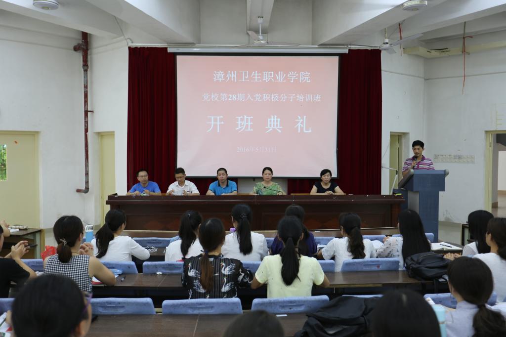 2016年5月31日下午,漳州卫生职业学院党校第28期入党积极分子培训班开班式在明德楼106大梯教顺利举行。党委委员、党委工作部部长蓝淑华、药学系党总支书记陈义三、临床医学系党总支书记颜晓萍、护理系党总支副书记蔡韶滨、健康与保健系党总支副书记钟明锋等出席开班典礼。党委工作部组织科科长张文钦主持开班式。