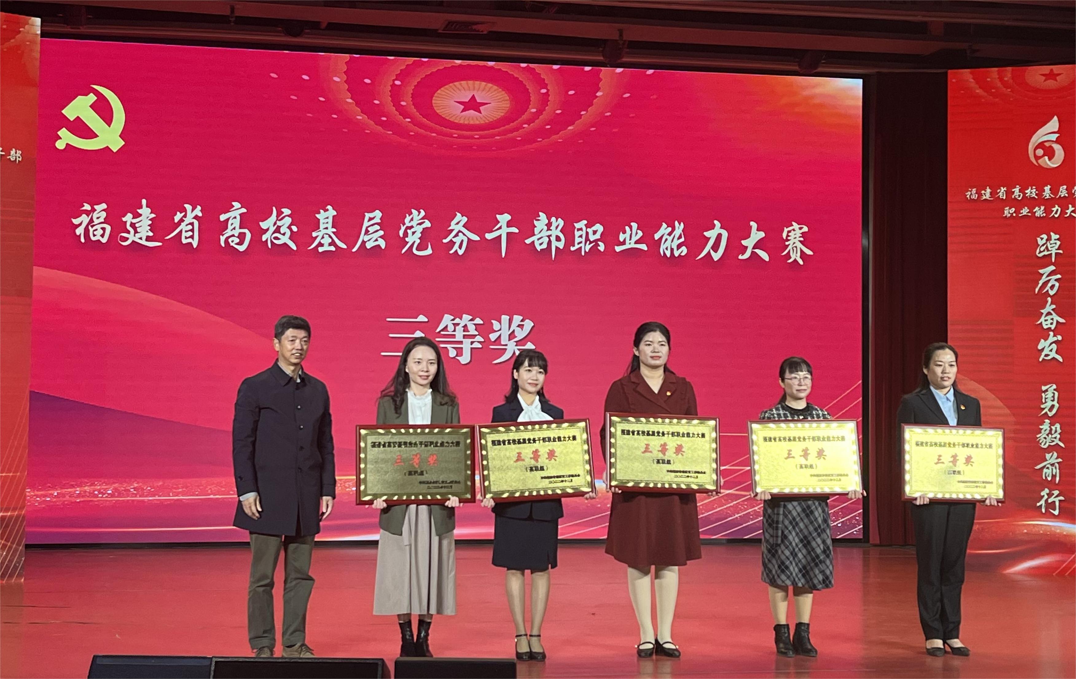 近日,福建省首届高校基层党务干部职业能力大赛落下帷幕。经过激烈角逐,由方舒婷、陈伟军、陈荣珠等3名党务干部组建的团队荣获全省高职院校团体三等奖,方舒婷老师获“知识测试”赛项全省第四名,“主题党日策划”赛项获全省第七名。
