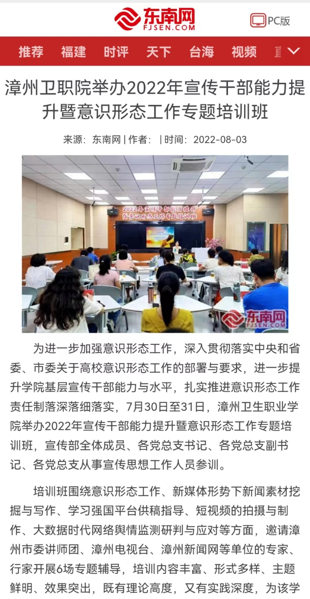 东南网:漳州卫职院举办2022年宣传干部能力提升暨意识形态工作专题培训班