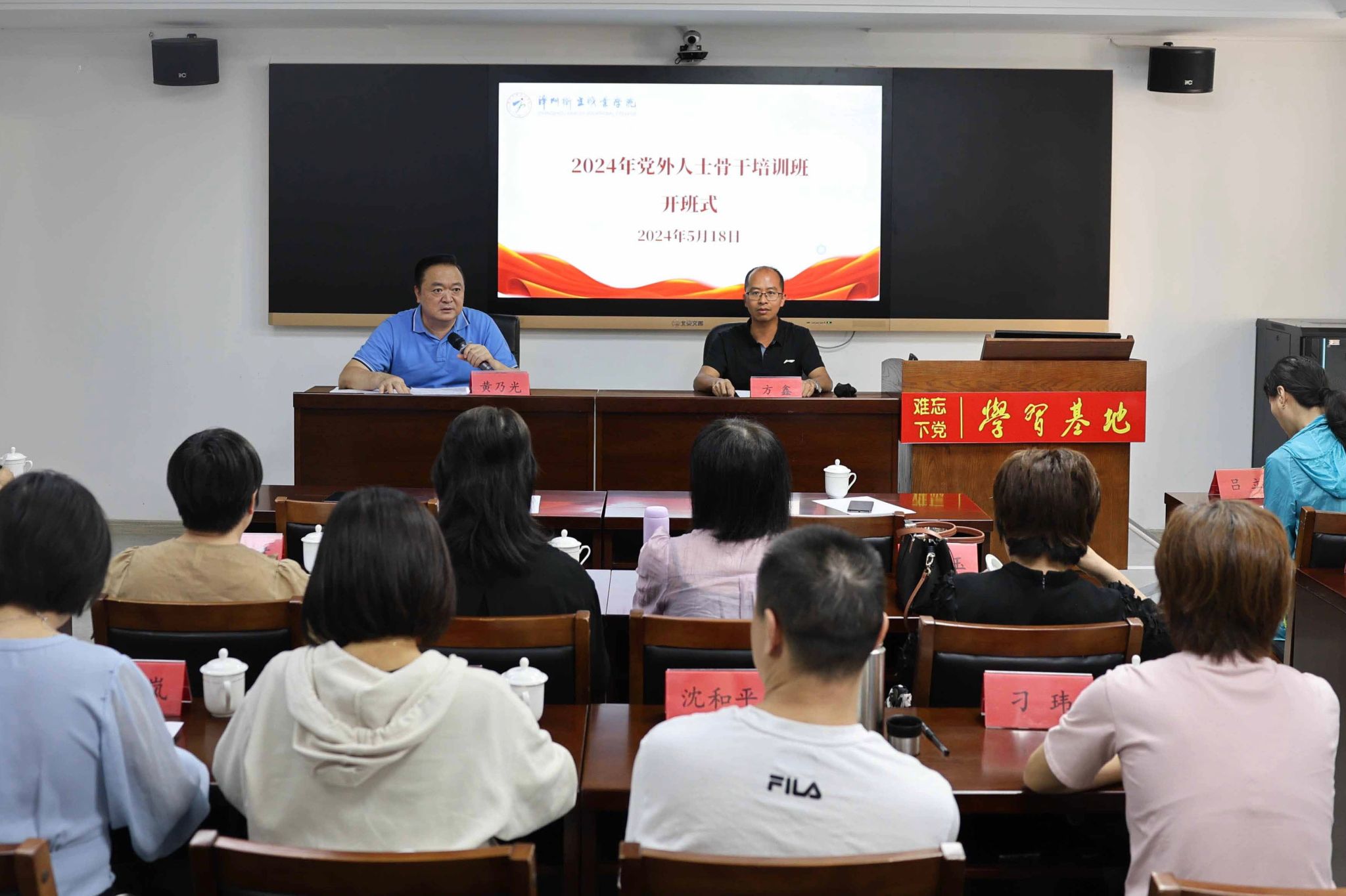 黄乃光作开班式讲话,他指出,全体学员要以此次培训为契机,以立德树人为根本,提高教书育人本领,积极推动学校双高建设和本科培育工作。他强调,要画好“同心圆”,增强政治聚合力。加强政治理论学习,切实把理论学习作为一项重要政治任务抓紧抓好,通过培训改造自我、锻造自我、提升自我。要织牢“责任网”,提质效促发展。今年是90周年校庆,要紧扣学校发展大局,充分发挥自身专业优势,在推动学校内涵建设、人才培养、科学研究和社会服务工作中有举措、有作为。要筑牢“防火墙”,守规矩筑防线。以党纪学习教育为契机,增强纪律意识,不断提高分析问题、解决问题的能力,切实把学习成果转化为争优争先争效的精气神,共同为推动学校发展奉献力量。