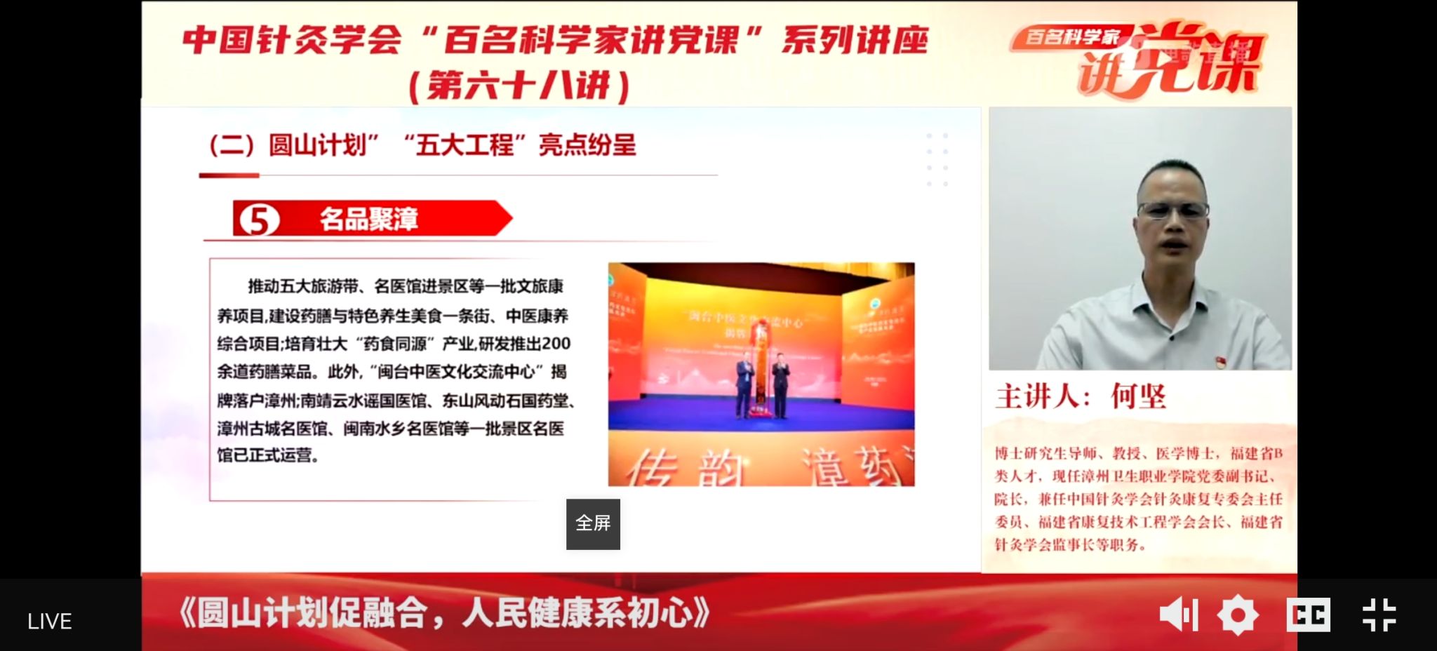 为深入学习贯彻习近平新时代中国特色社会主义思想,贯彻落实全国科技大会精神,根据中国针灸学会“百名科学家讲党课”系列讲座栏目安排,10月29日下午,中国针灸学会针康专委会主任委员、福建省康复技术工程学会会长、福建省针灸学会监事长,学校党委副书记、校长何坚为全国针灸同仁讲授了一堂题为“圆山计划促融合,人民健康系初心”的精彩讲座,讲座由中国针灸学会党委副书记、副会长兼秘书长景向红主持。