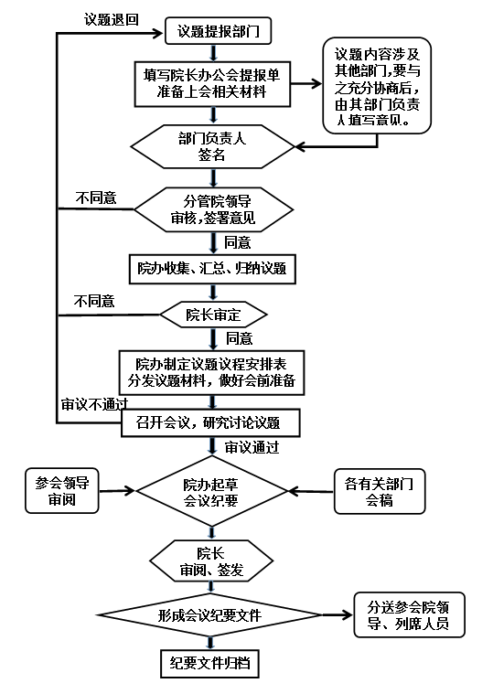 1.凡提交院长办公会讨论的议题,各主办的系部、处室、直属科必须做好充分调研,若涉及协办部门事先要进行充分协商,重大事项应有充分论证。