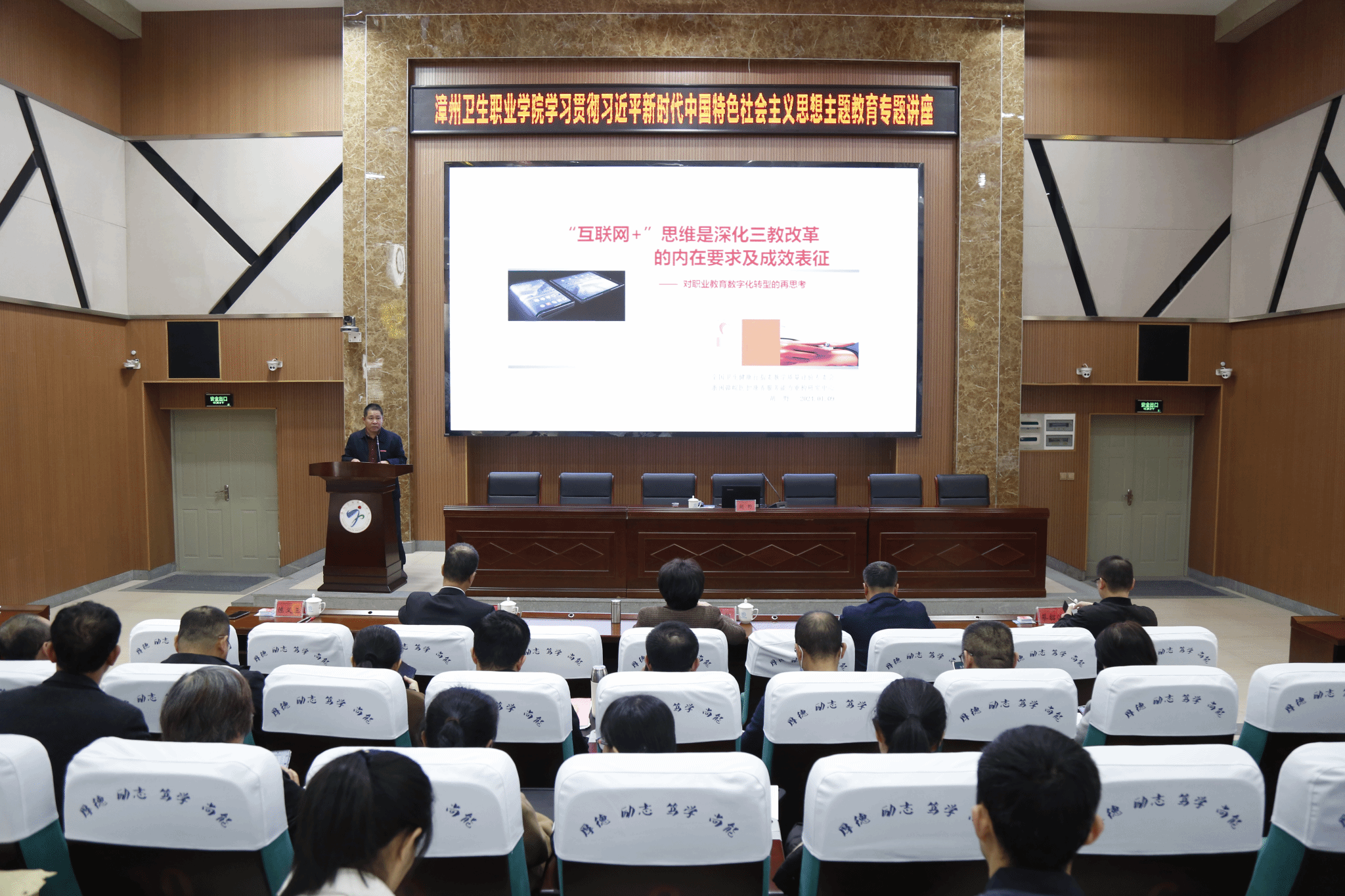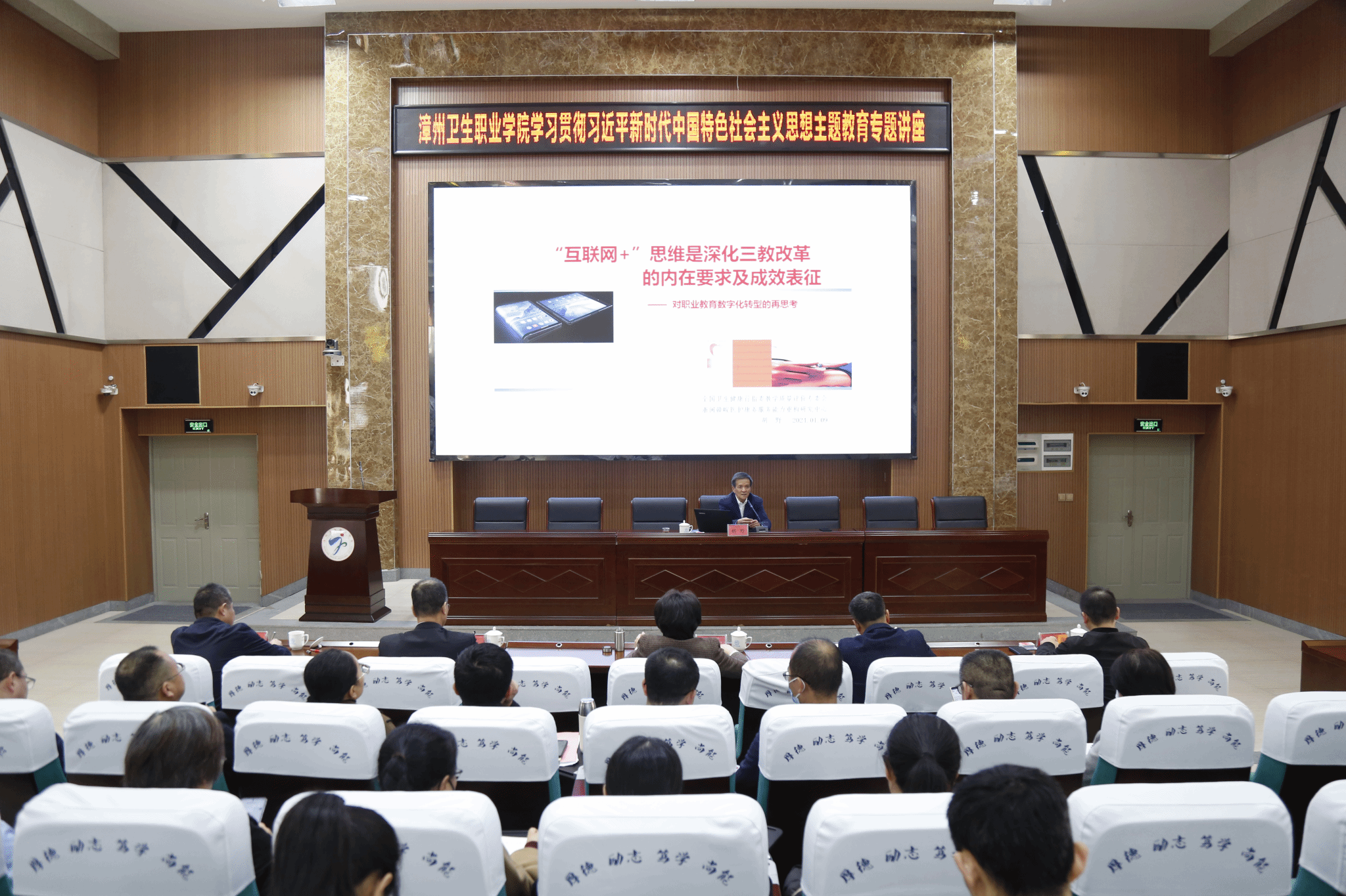 为深入学习党的二十大精神,助力学习贯彻习近平新时代中国特色社会主义思想主题教育走深走实,推动学校高质量发展,特邀请全国知名专家胡野教授作开展《“互联网+”思维是三教改革提质培优的重要表征—对职业教育数字化转型的再思考》专题讲座。学校班子成员、全体副科级及以上干部、专业带头人、骨干教师、教授、教研室主任、科研平台负责人参会。会议由学校党委委员、副校长陈义三主持。