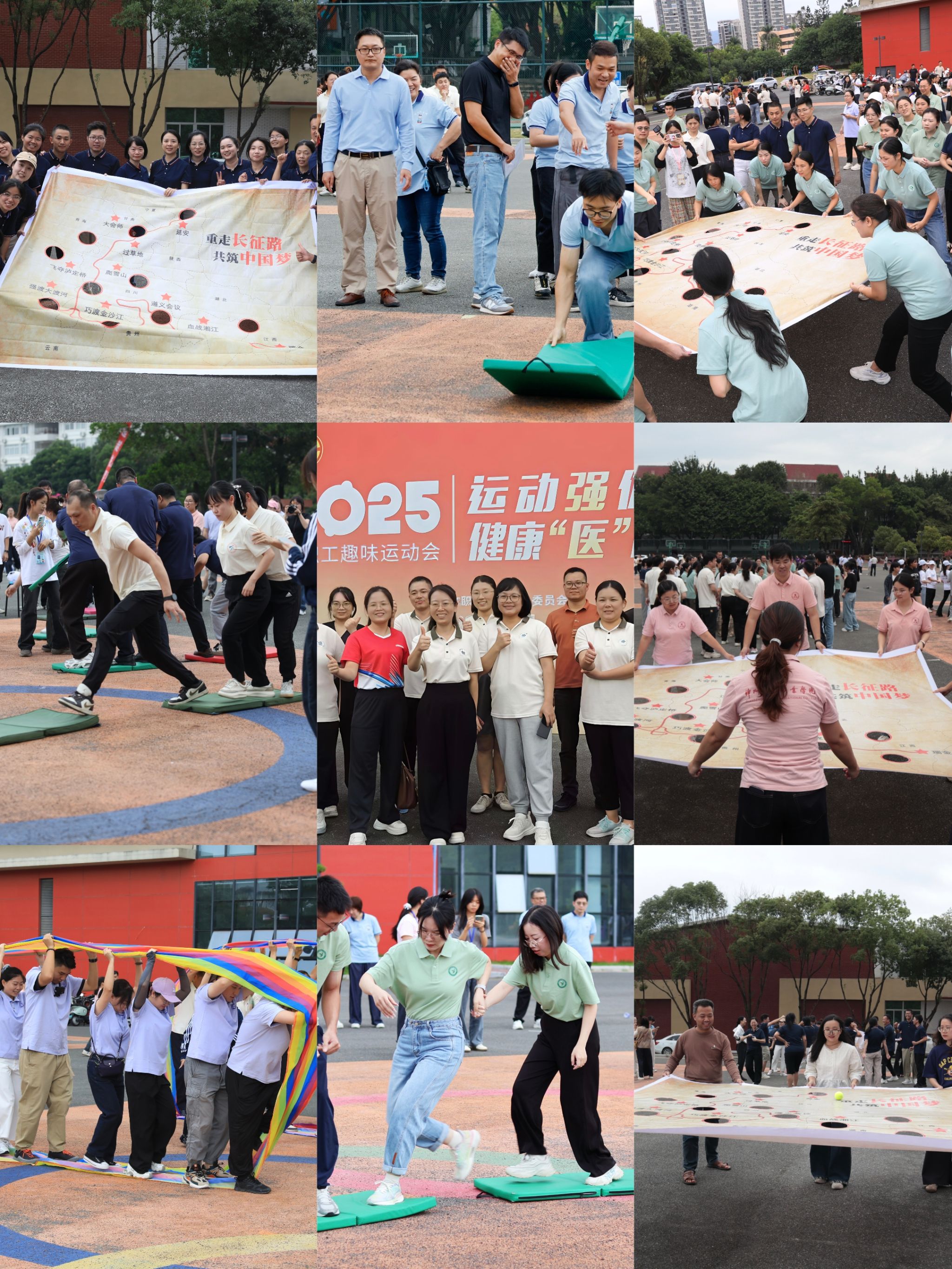 为丰富教职工文化生活,增强教师团队凝聚力,10月31日下午,我校在体育艺术中心广场举办以“运动强体魄 健康‘医’路行”为主题的教职工趣味运动会。来自学校9个分工会的200余名教职工齐聚赛场,在欢声笑语中共享运动乐趣。