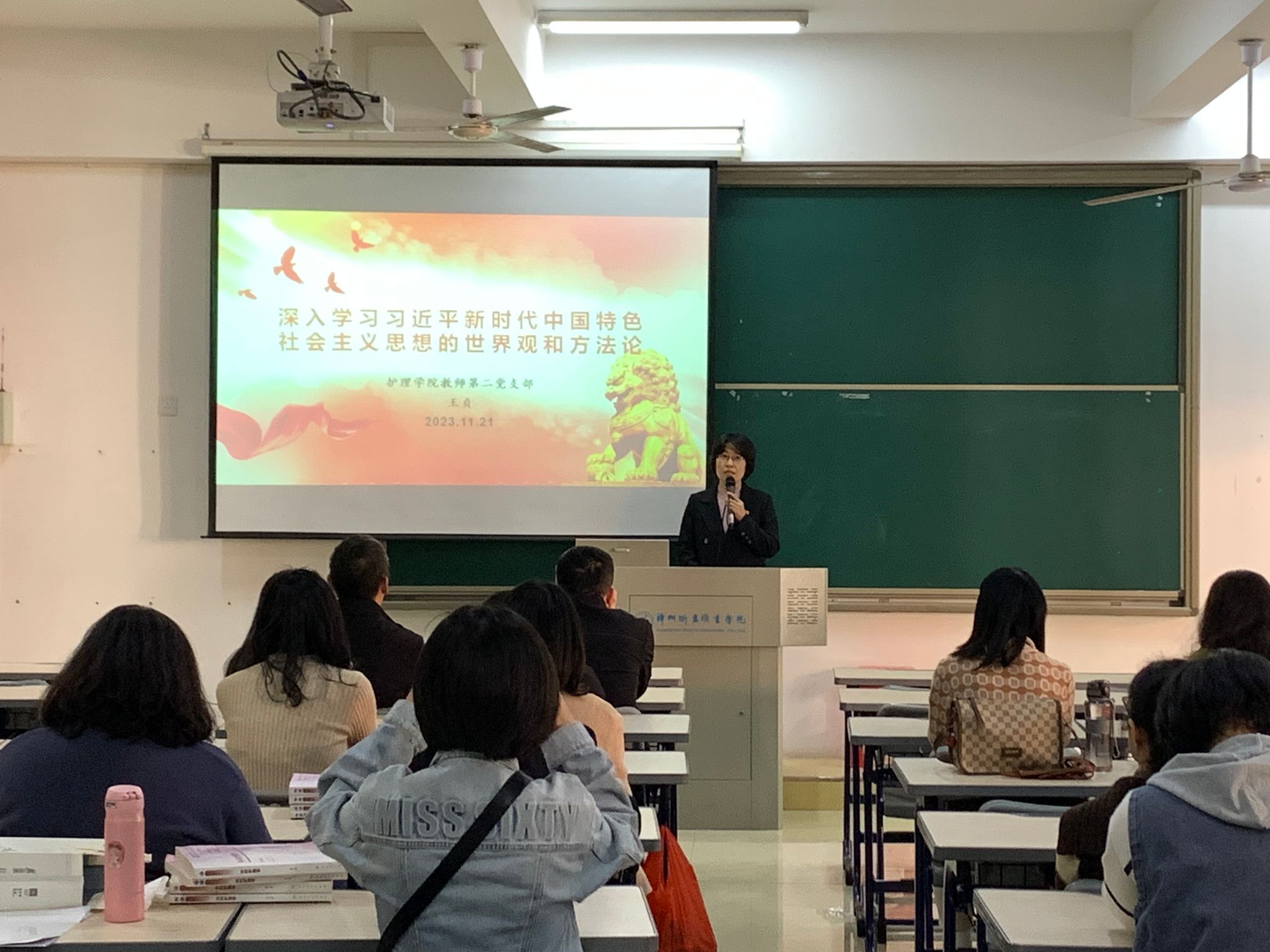 为深入开展主题教育、学懂弄通做实习近平新时代中国特色社会主义思想,11月21日,护理学院于励志楼205开展专题学习会,深入学习习近平新时代中国特色社会主义思想的世界观方法论。本次会议由王贞老师主讲,全体教工党员参加。