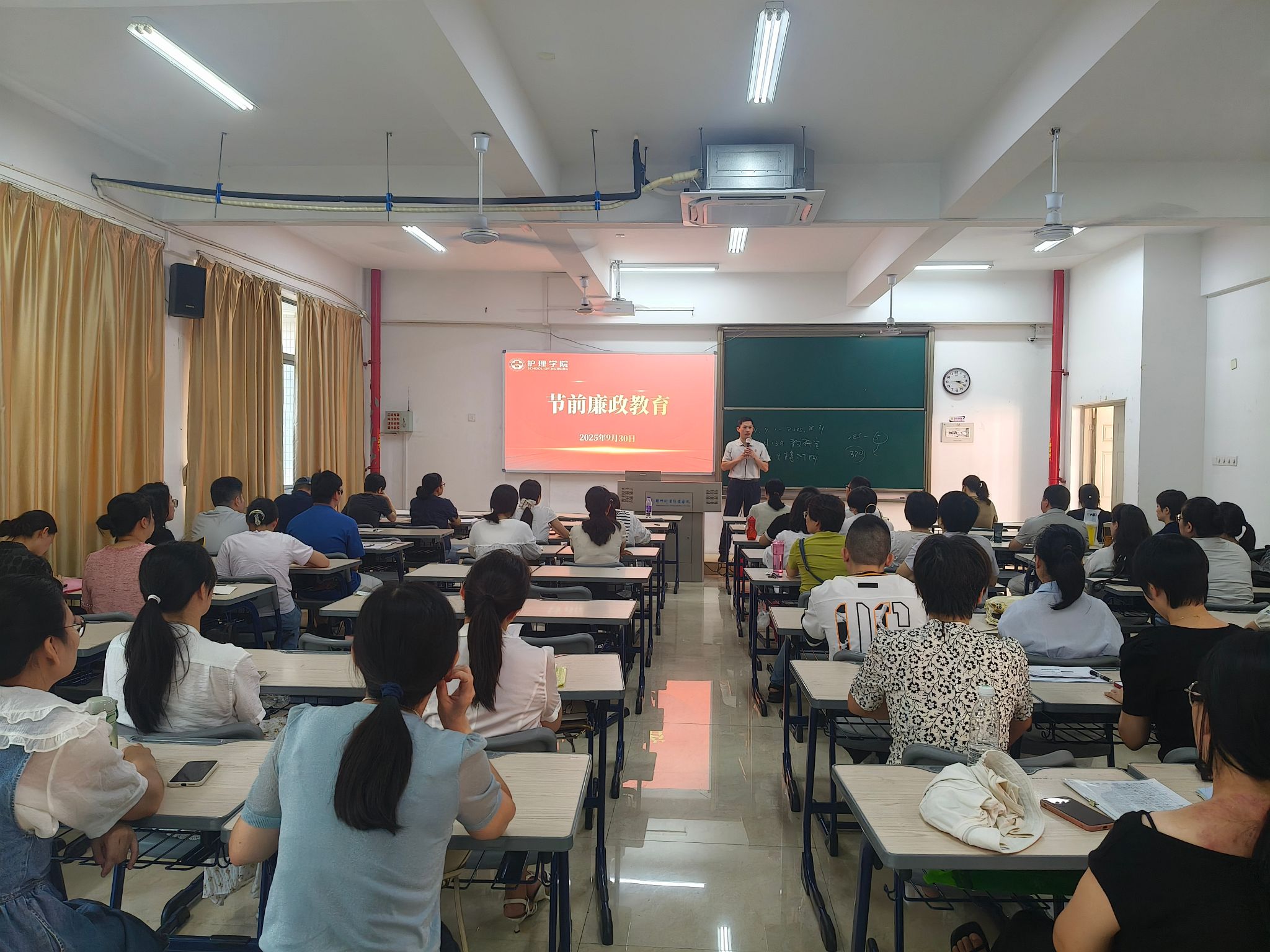 在中秋、国庆“双节”即将来临之际,为进一步强化党风廉政建设,筑牢廉洁自律防线,营造风清气正的节日氛围,9月30日,护理学院召开节前廉政教育会议。会议由主持工作的党总支副书记主持,全体教职工参加。
